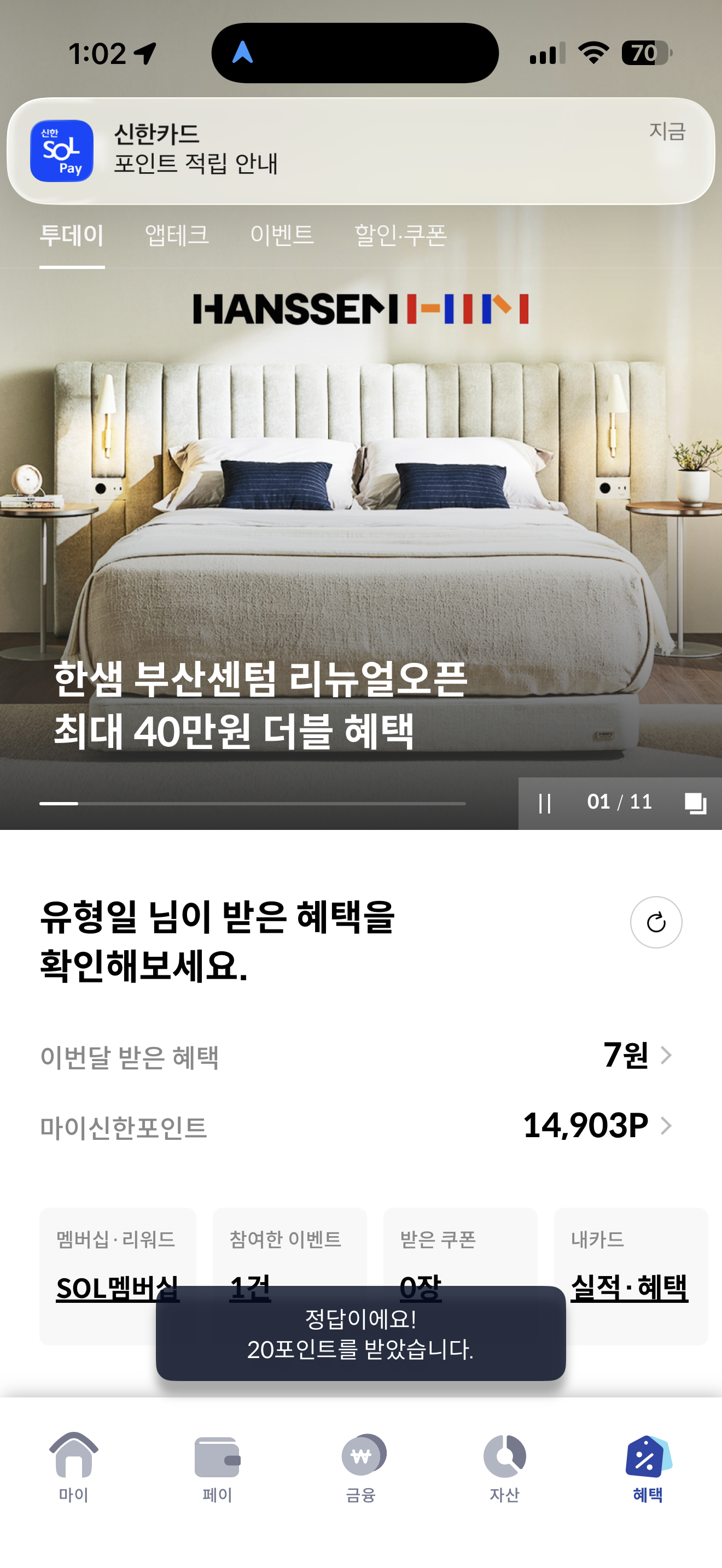 신한카드 퀴즈팡팡 정답은 30번 입니다