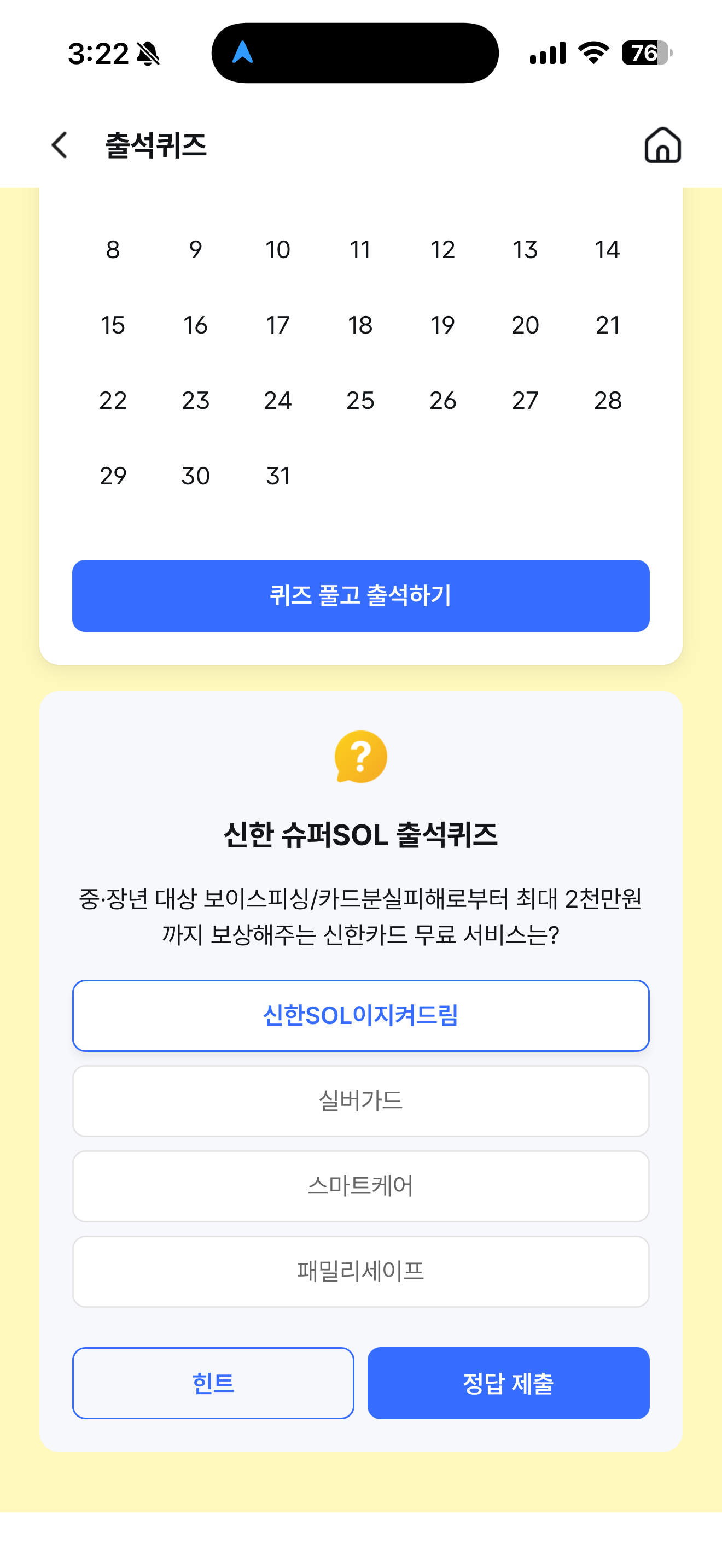 신한 슈퍼SOL 출석퀴즈 12월 1일 정답(중 장년 대상 보이스피싱/카드분실피해로부터 최대 2천만원까지 보상해주는 신한카드 무료 서비스는?)