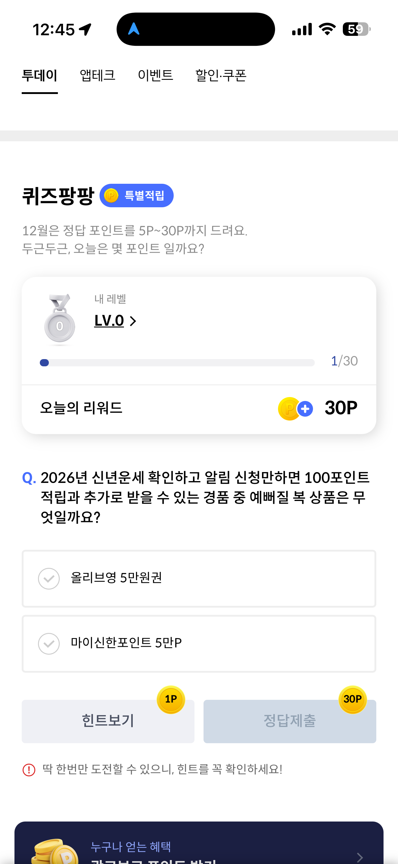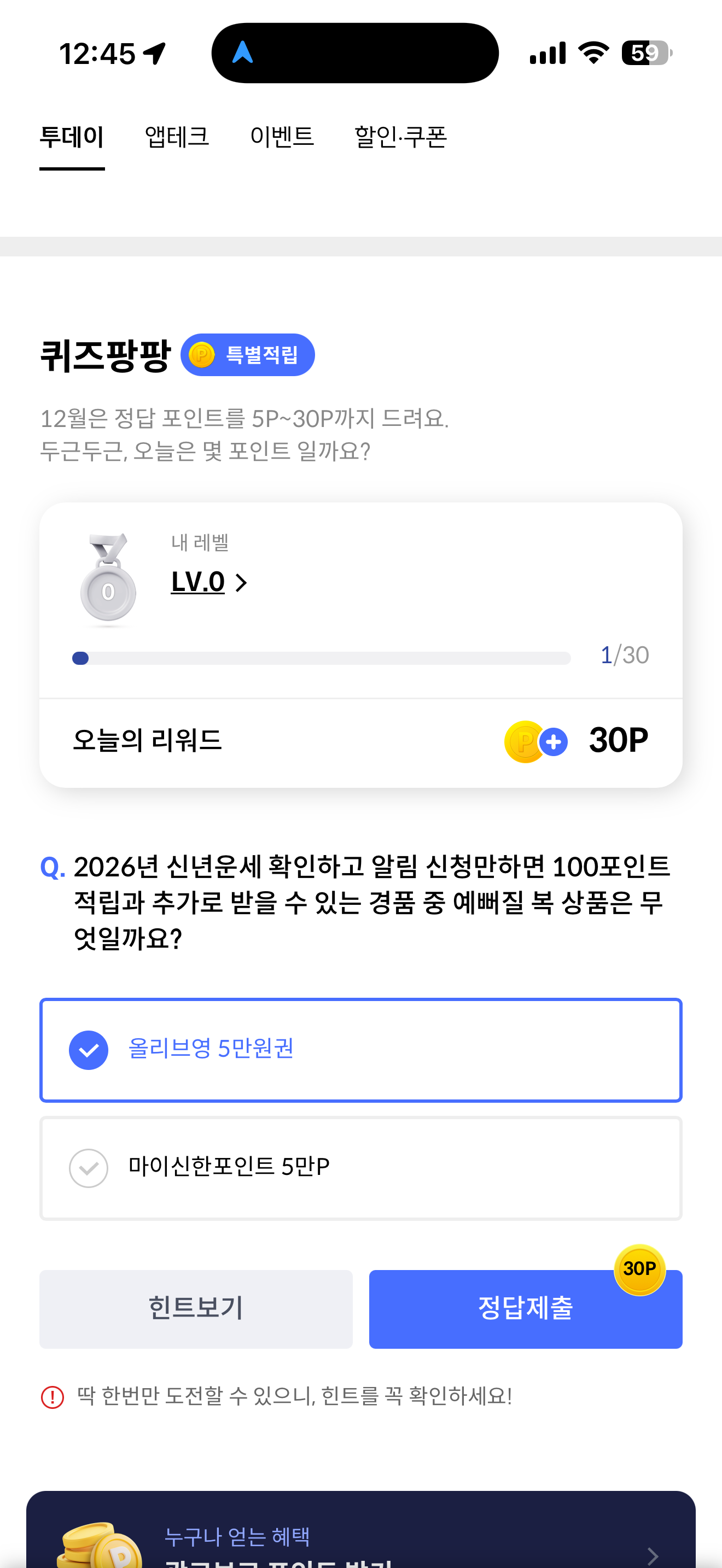 2026년 신년운세 확인하고 알림 신청만하면 100포인트 적립과 추가로 받을 수 있는 경품 중 예뻐질 복 상품은 무엇일까요? 보기는 1. 올리브영 5만원권 2. 마이신한포인트 5만P 입니다