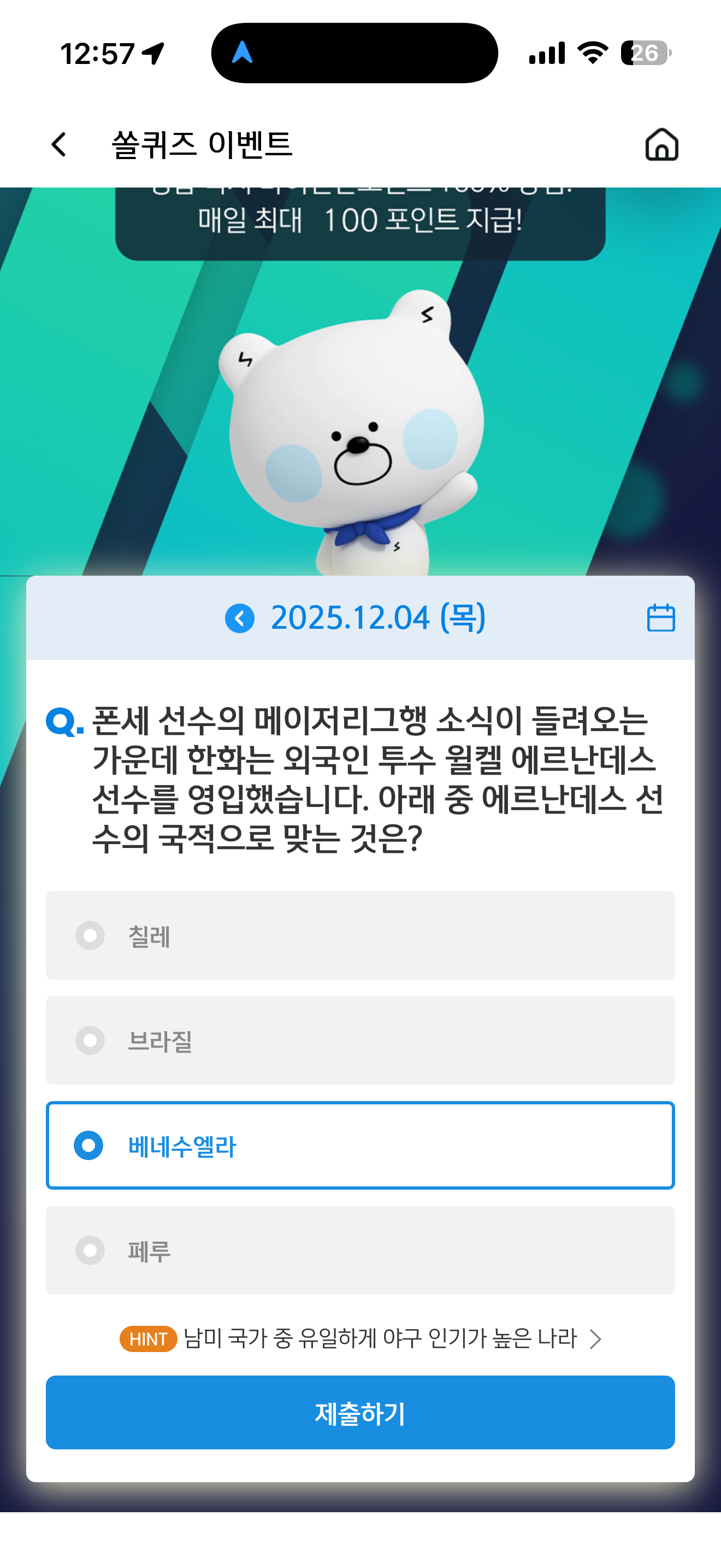 신한 슈퍼SOL 야구/상식 쏠퀴즈 정답은 베네수엘라 입니다