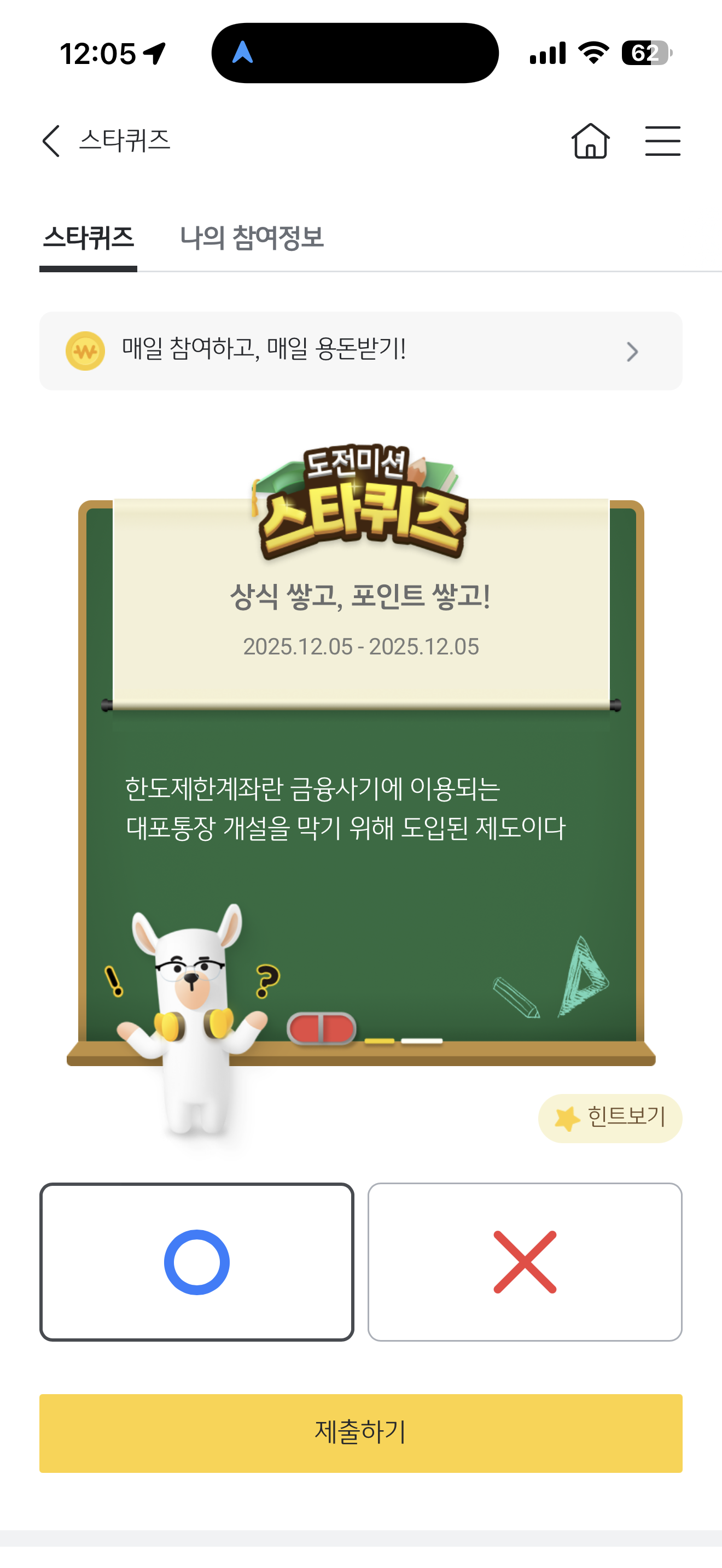 KB스타뱅킹 스타퀴즈 12월 5일 정답(한도제한계좌란 금융사기에 이용되는 대포통장 개설을 막기 위해 도입된 제도이다)