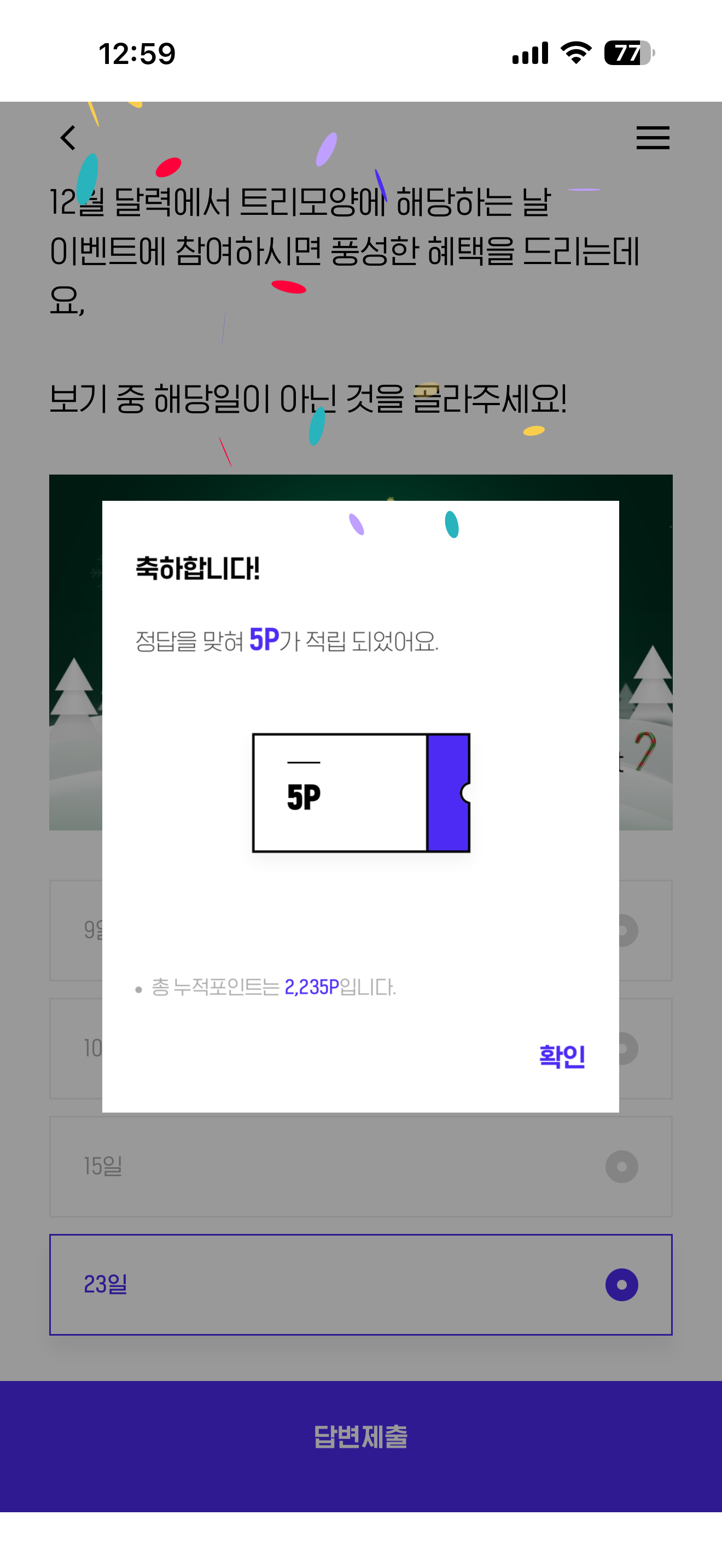 H포인트 퀴즈 12월 5일 정답(크리스마스 선물 대작전 12월 하이라이트 캘린더 이벤트에 참여하시고 산타의 선물을 주워주세요! 12월 달력에서 트리모양에 해당하는 날 이벤트에 참여하시면 풍성한 혜택을 드리는데요, 보기 중 해당일이 아닌 것을 골라주세요!)