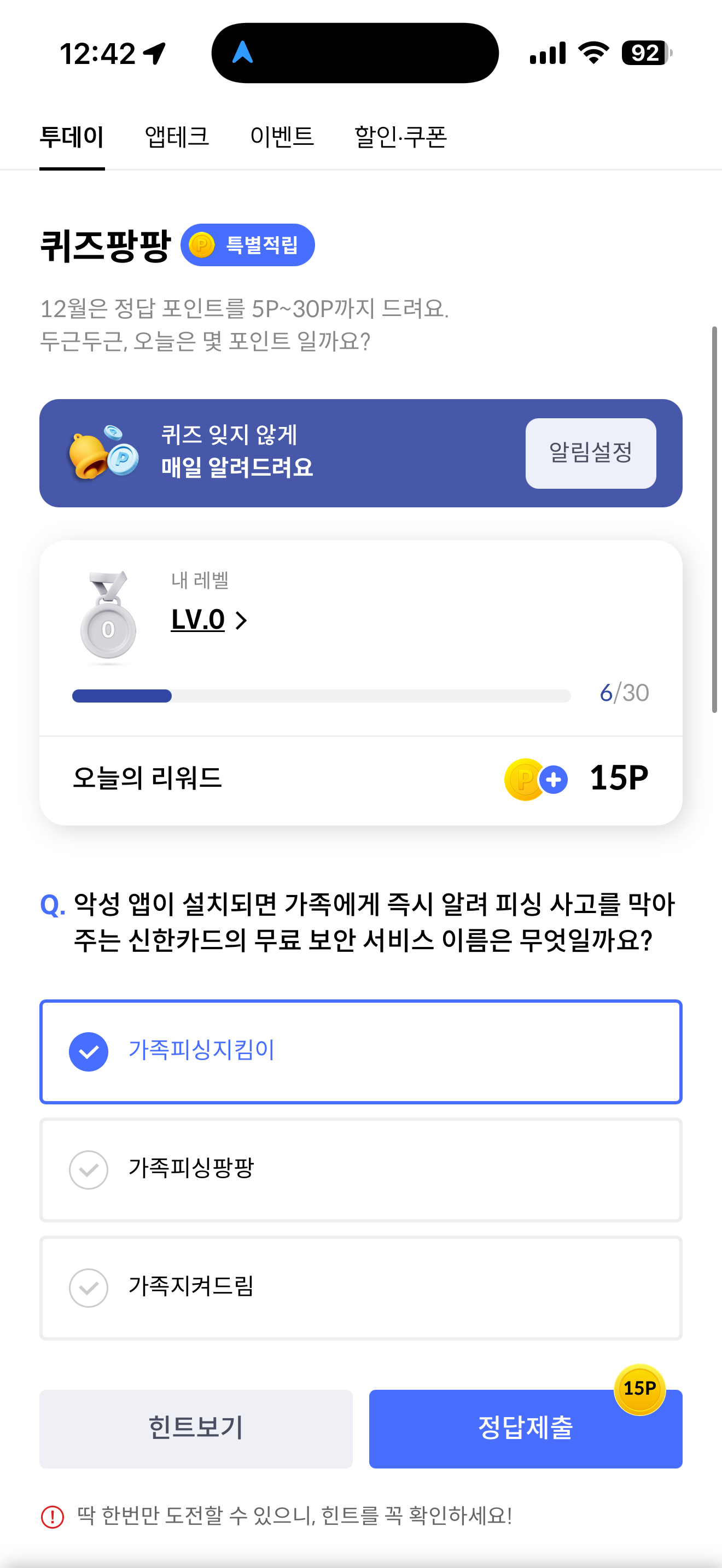 신한카드 퀴즈팡팡 정답은 가족피싱지킴이 입니다