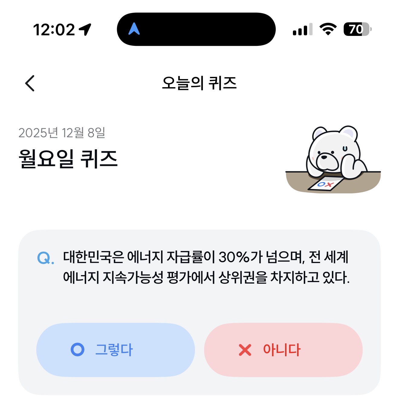 기후행동 기회소득 오늘의 퀴즈 12월 8일 정답(대한민국은 에너지 자급률이 30%가 넘으며, 전 세계 에너지 지속가능성 평가에서 상위권을 차지하고 있다)