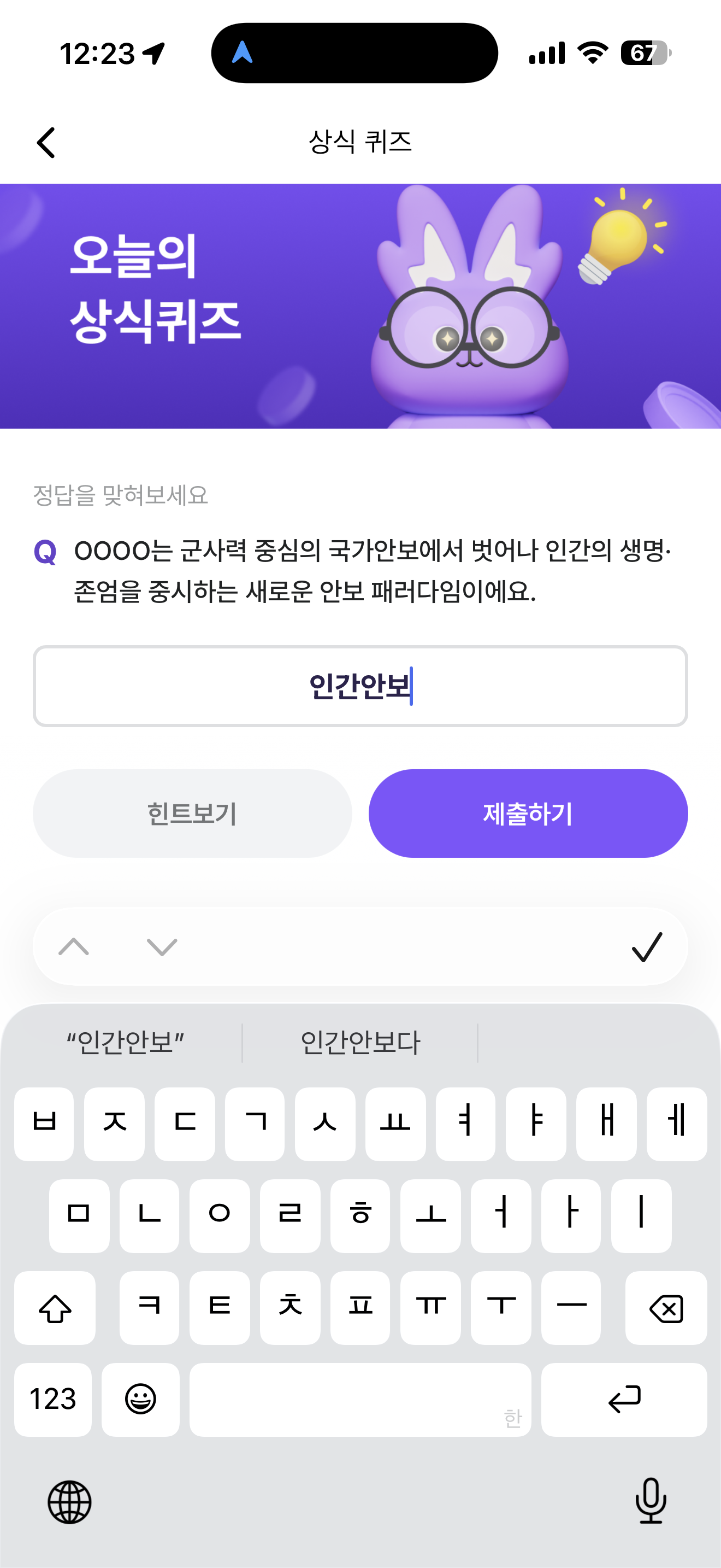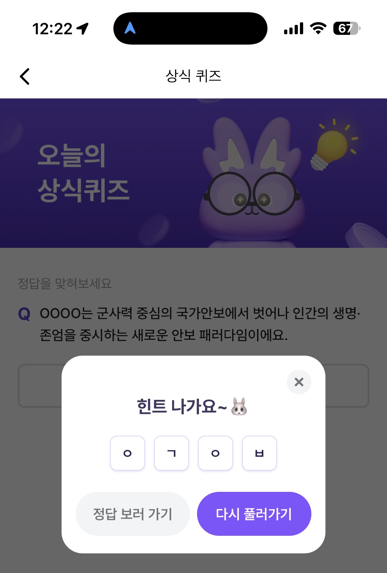 비트버니 오늘의 퀴즈 12월 8일 ㅇㄱㅇㅂ 정답(OOOO는 군사력 중심의 국가안보에서 벗어나 인간의 생명 존업을 중시하는 새로운 안보 패러다임이에요)