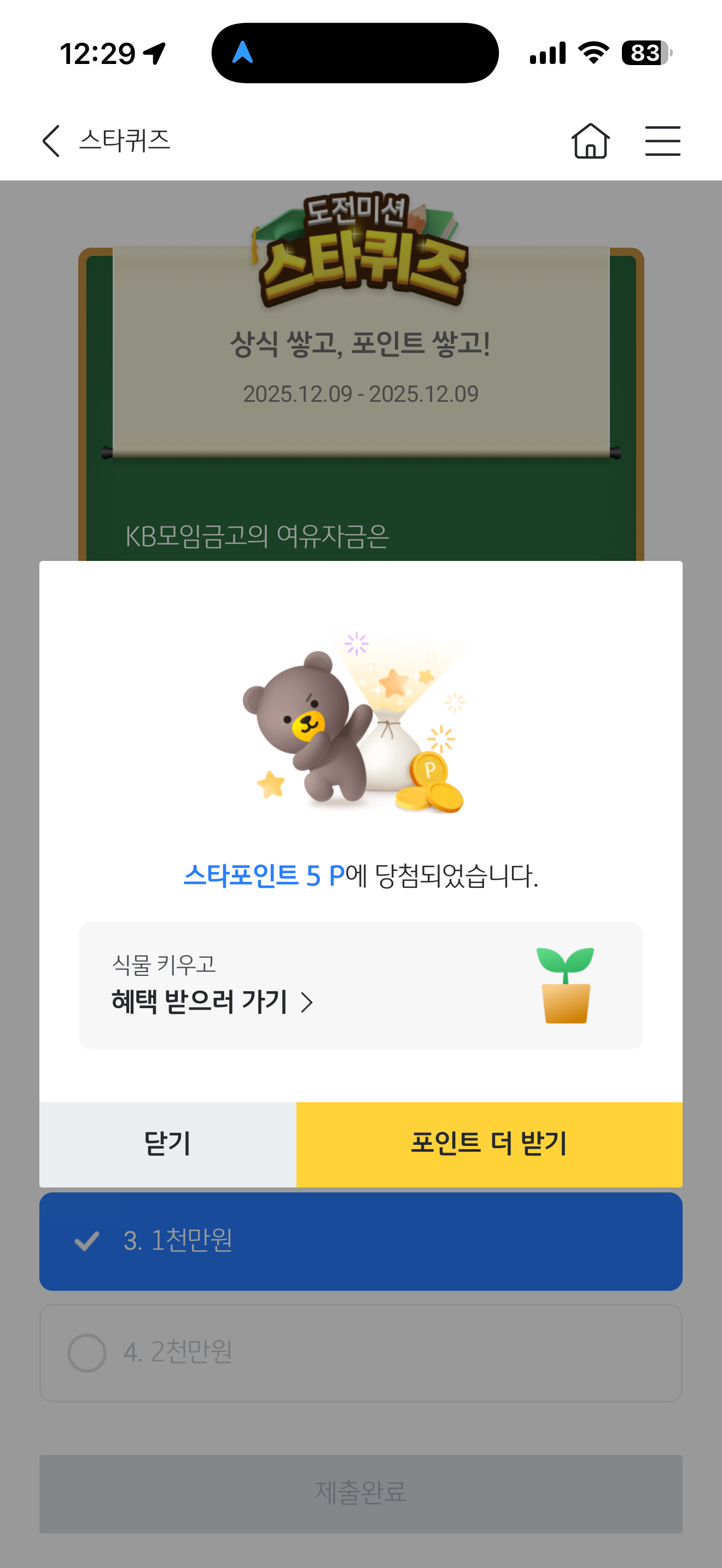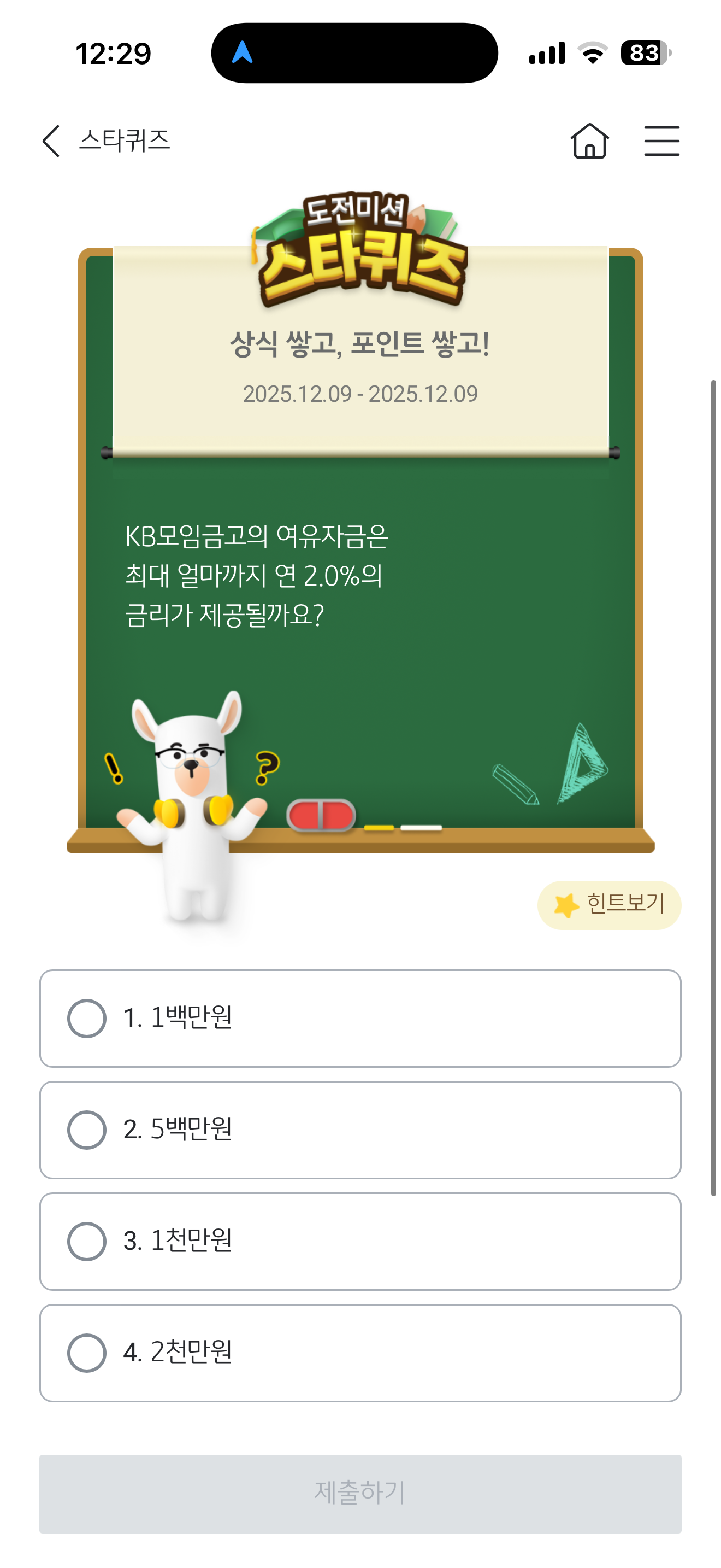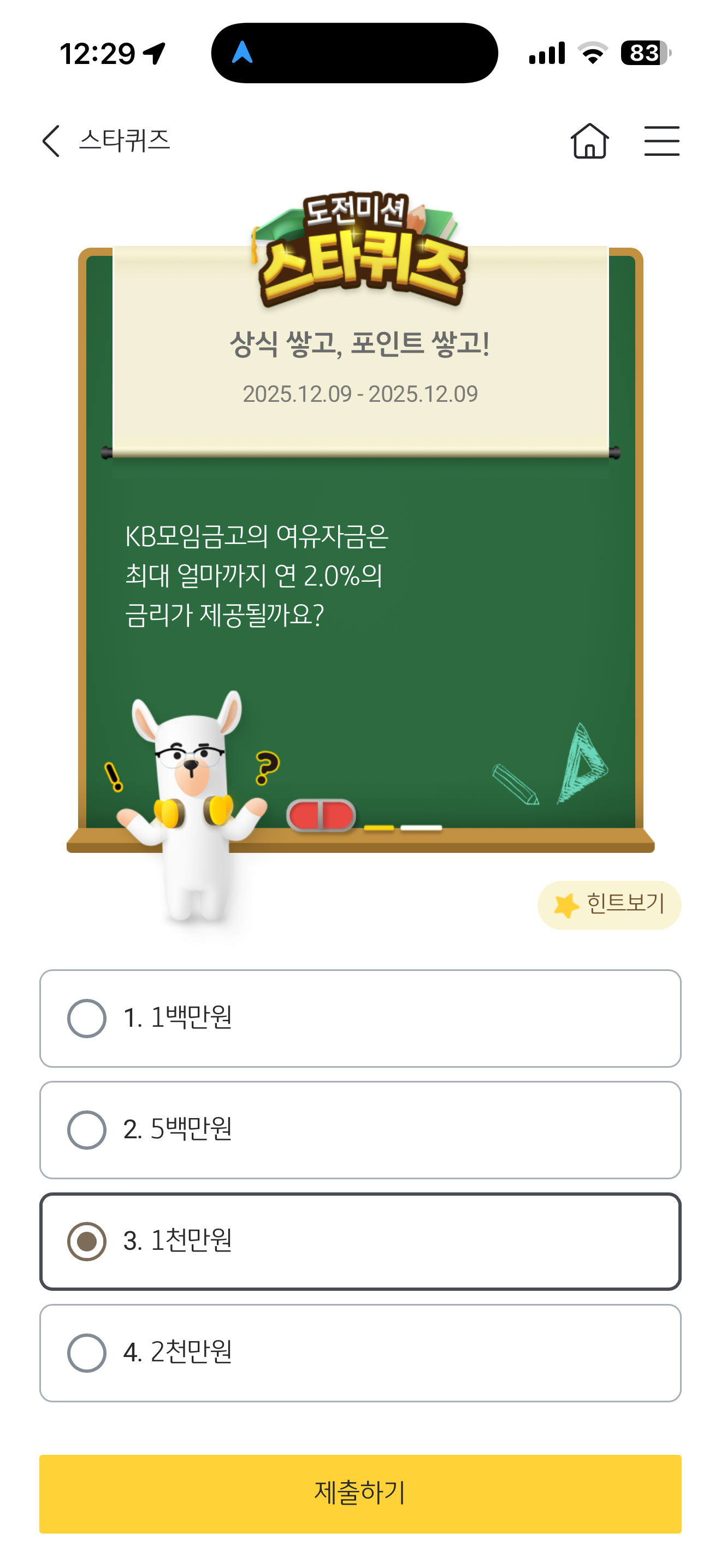 KB스타뱅킹 스타퀴즈 12월 9일 정답(KB모임금고의 여유자금은 최대 얼마까지 연 2.0%의 금리가 제공될까요?)