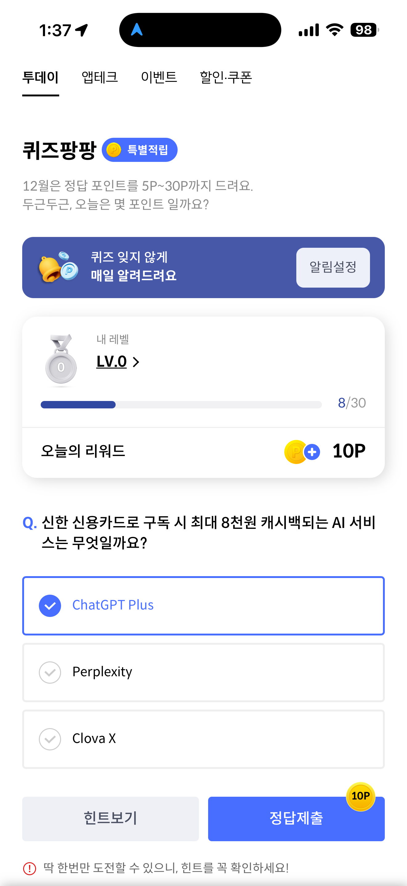 신한카드 퀴즈팡팡 정답은 ChatGPT Plus 입니다