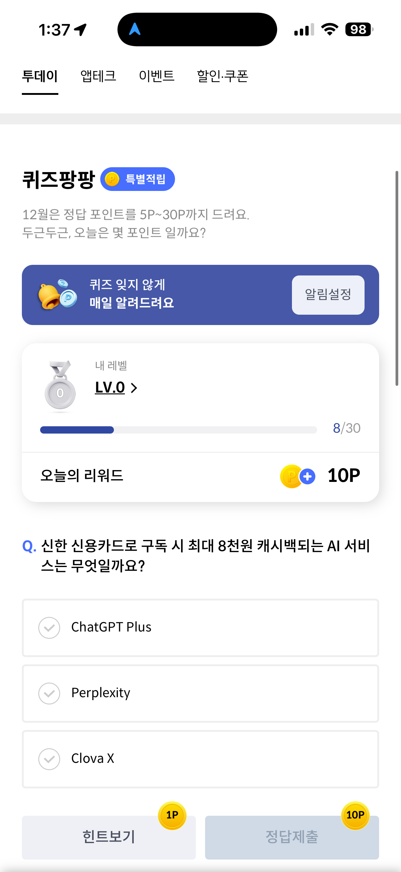 신한 신용카드로 구독 시 최대 8천원 캐시백되는 AI 서비스는 무엇일까요? 보기는 1. ChatGPT Plus 2. Perplexity 3. Clova X 입니다. 신한 신용카드를 사용하면 최대 8천원 캐시백을 받을 수 있습니다 참고해서 활용해 보세요