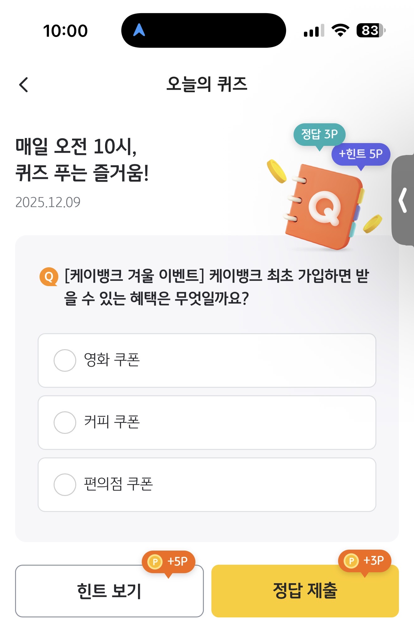 [케이뱅크 겨울 이벤트] 케이뱅크 최초 가입하면 받을 수 있는 혜택은 무엇일까요? 보기는 1. 영화 쿠폰 2. 커피 쿠폰 3. 편의점 쿠폰 입니다. 케이뱅크를 가입하면 혜택을 받을 수 있으니 잘 참고해서 활용해 보세요