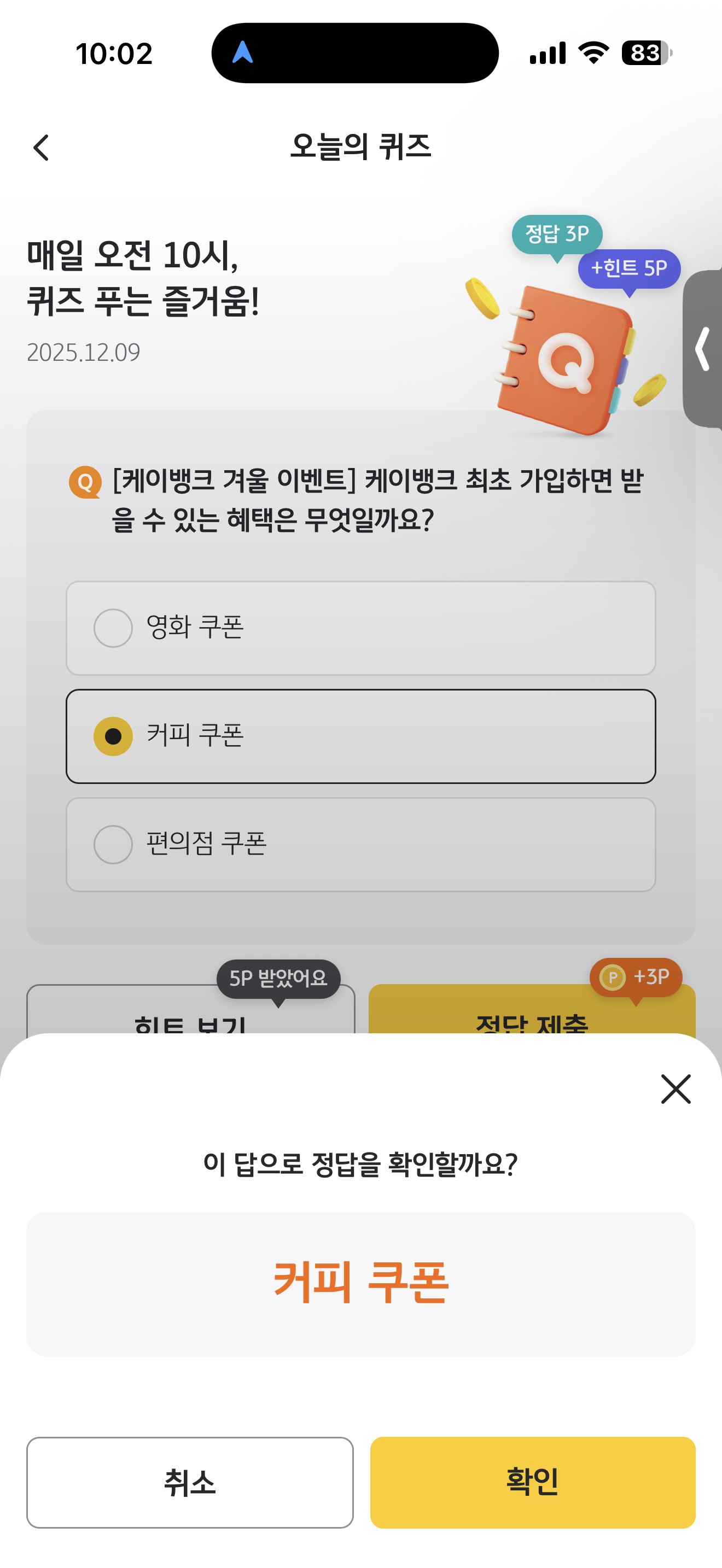 KB Pay 오늘의 퀴즈 정답은 커피 쿠폰 입니다