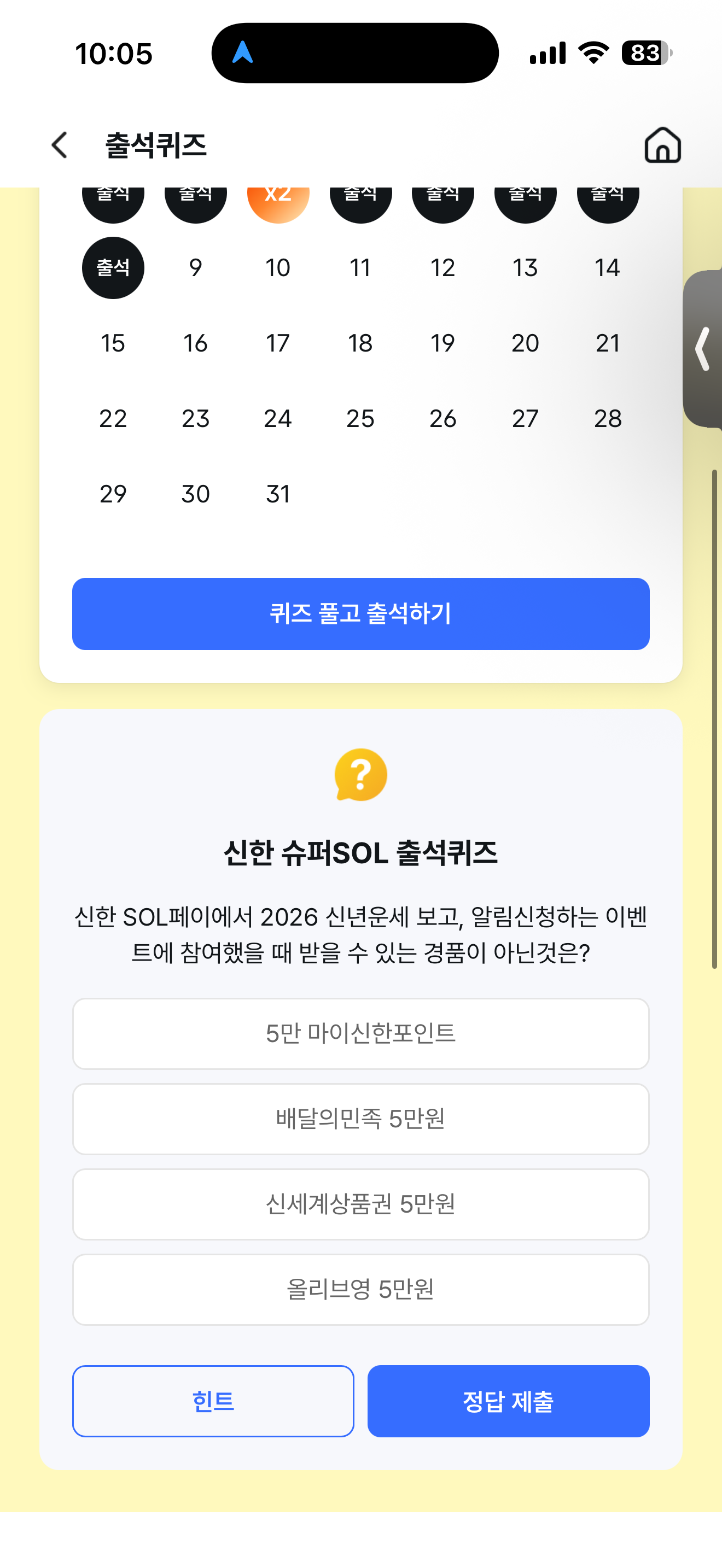 신한 슈퍼SOL 출석퀴즈 정답은 신세계상품권 5만원 입니다