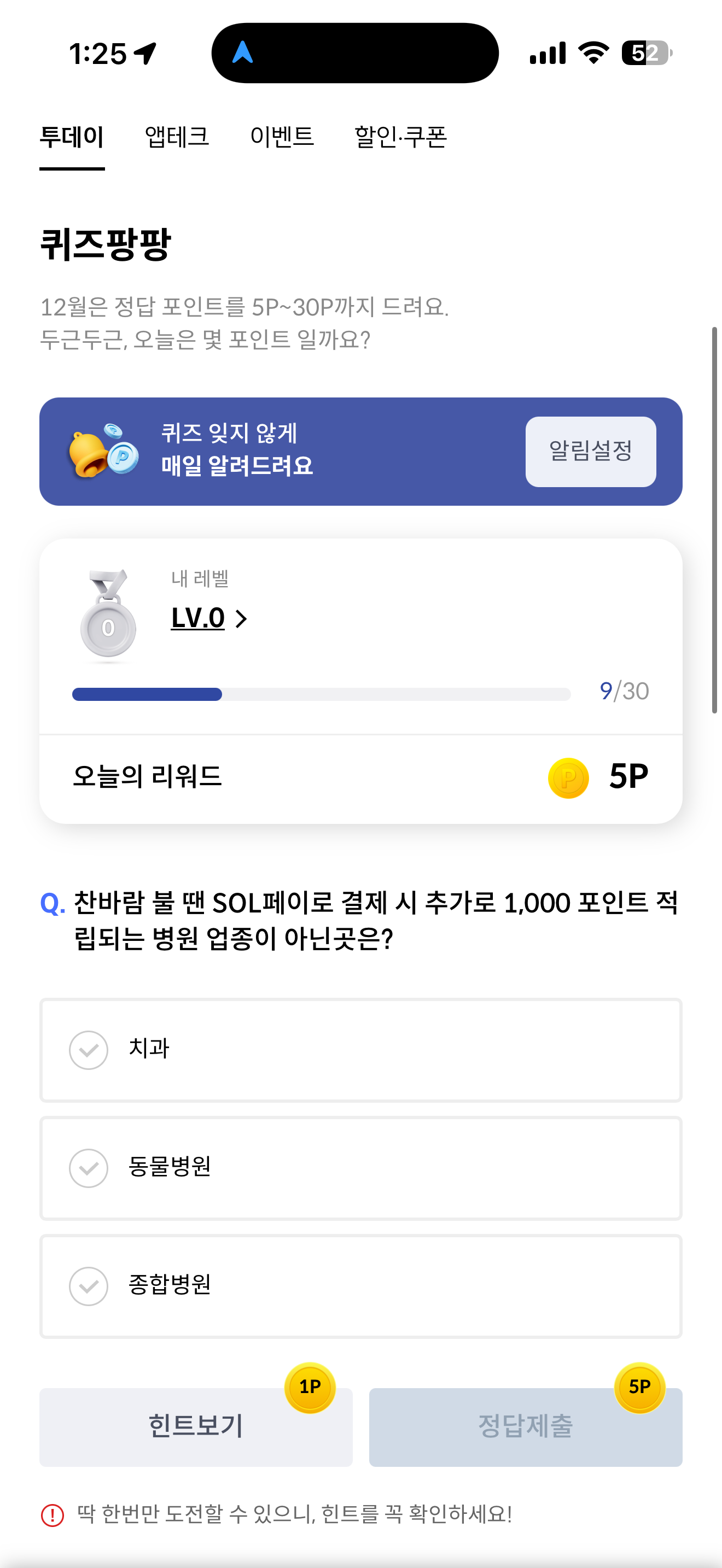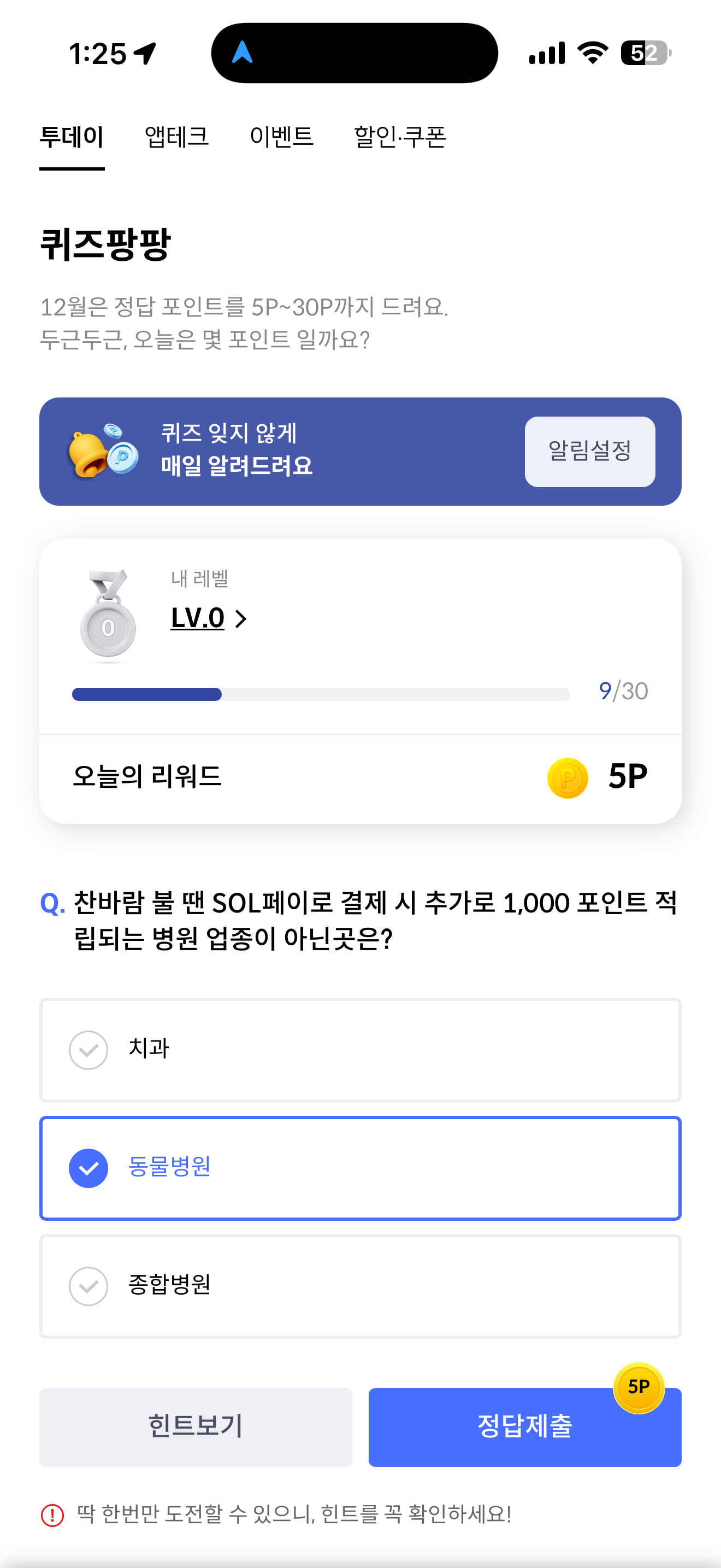 신한카드 퀴즈팡팡 12월 10일 정답(찬바람 불 땐 SOL페이로 결제 시 추가로 1,000 포인트 적립되는 병원 업종이 아닌곳은?)