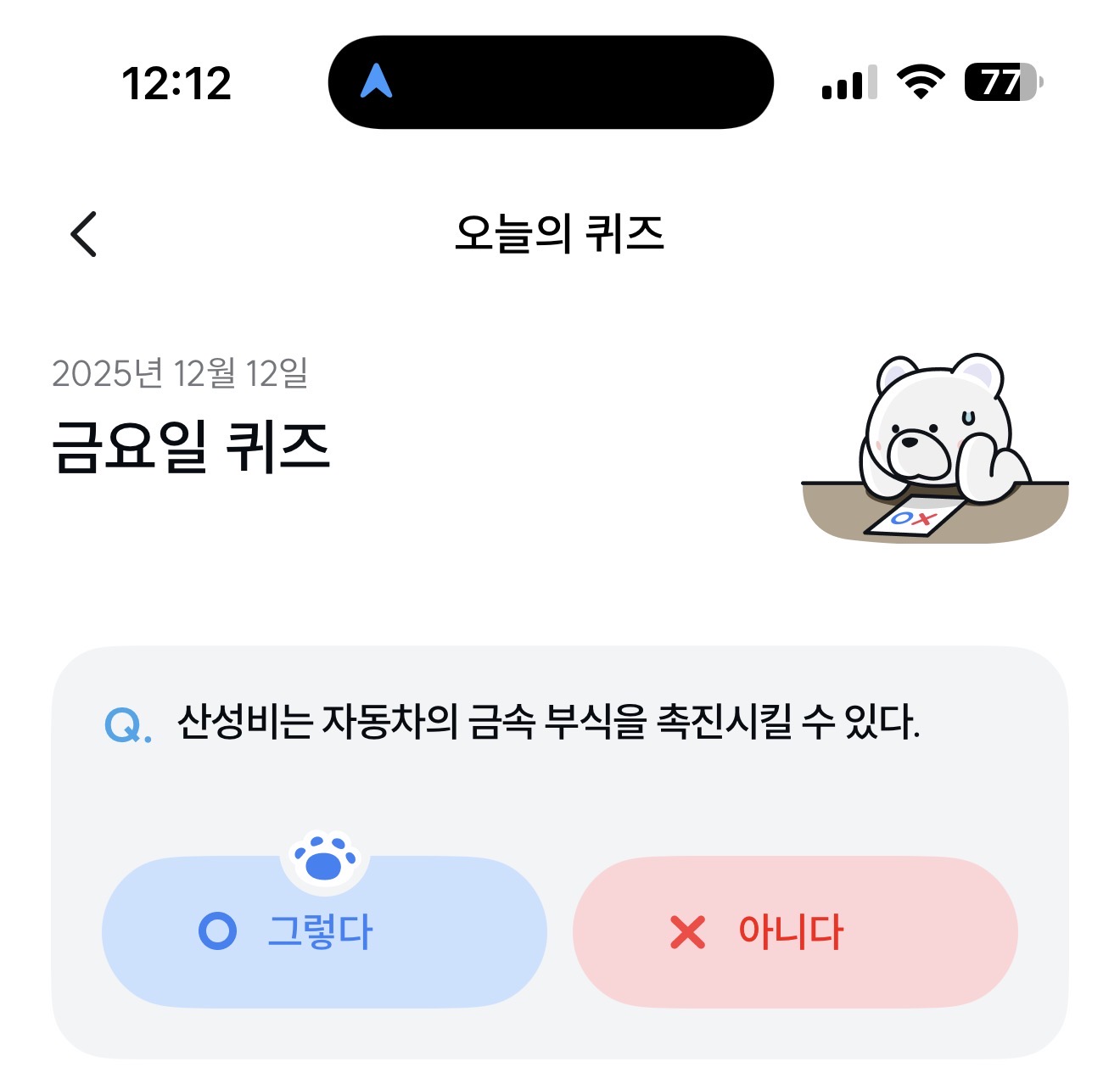 기후행동 기회소득 오늘의 퀴즈 12월 12일 정답(산성비는 자동차의 금속 부식을 촉진시킬 수 있다)