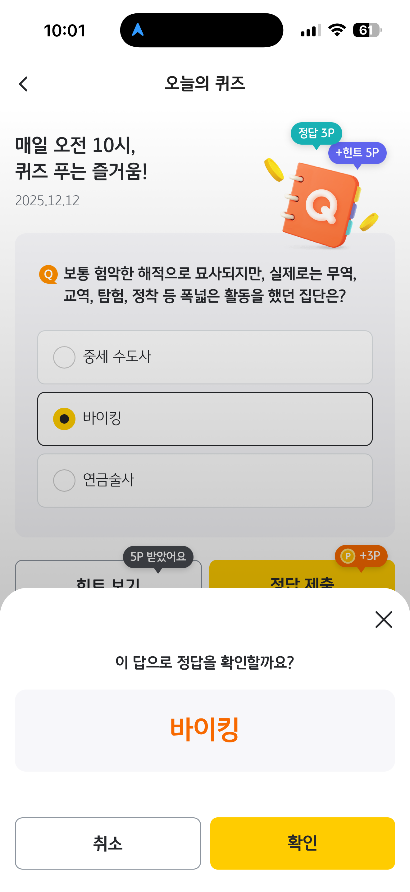 KB Pay 오늘의 퀴즈 정답은 바이킹 입니다