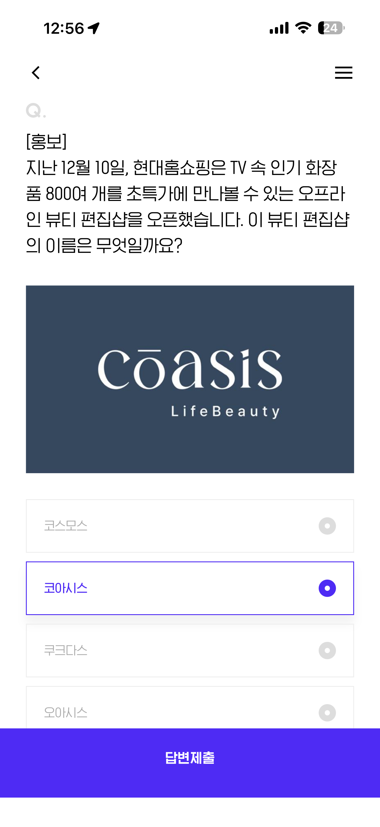 지난 12월 10일, 현대홈쇼핑은 TV 속 인기 화장품 800여 개를 초특가에 만나볼 수 있는 오프라인 뷰티 편집샵을 오픈했습니다. 이 뷰티 편집샵의 이름은 무엇일까요? 보기는 1. 코스모스 2. 코아시스 3. 쿠크다스 4. 오아시스 입니다