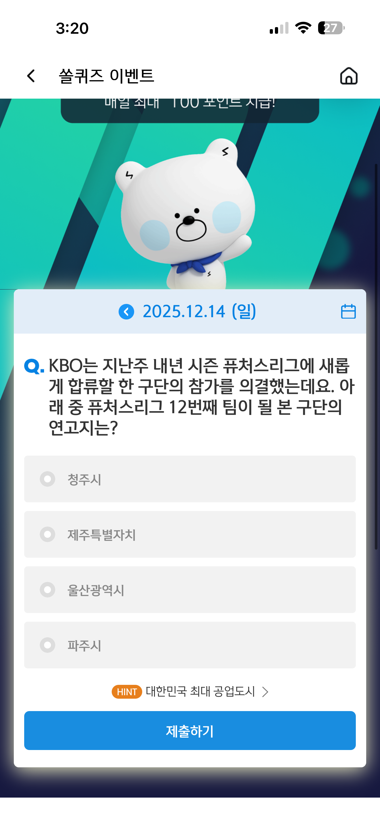 KBO는 지난주 내년 시즌 퓨처스리그에 새롭게 합류할 한 구단의 참가를 의결했는데요. 아래 중 퓨처스리그 12번째 팀이 될 본 구단의 연고지는? 보기는 1. 청주시 2. 제주특별자치 3. 울산광역시 4. 파주시 입니다