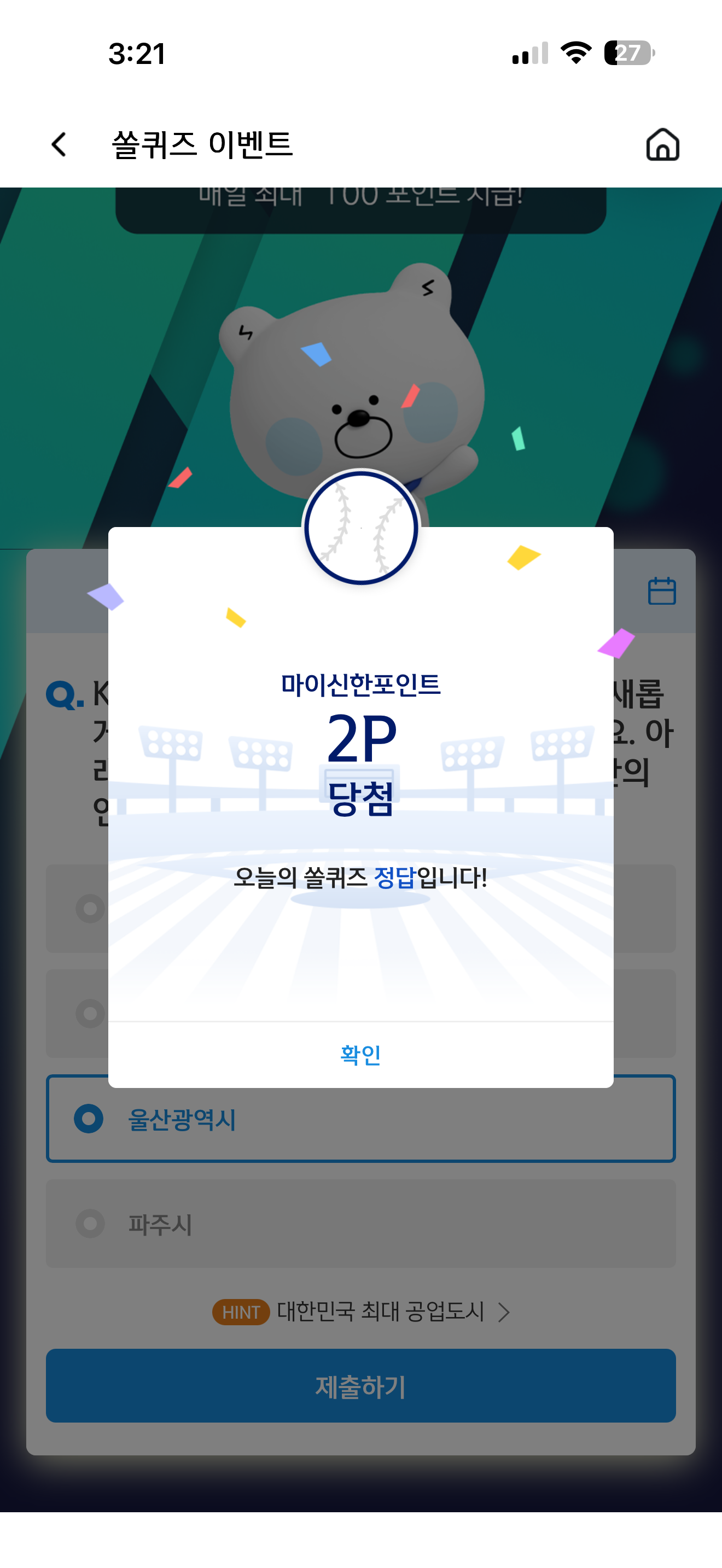 신한 슈퍼SOL 야구/상식 쏠퀴즈 정답은 울산광역시 입니다