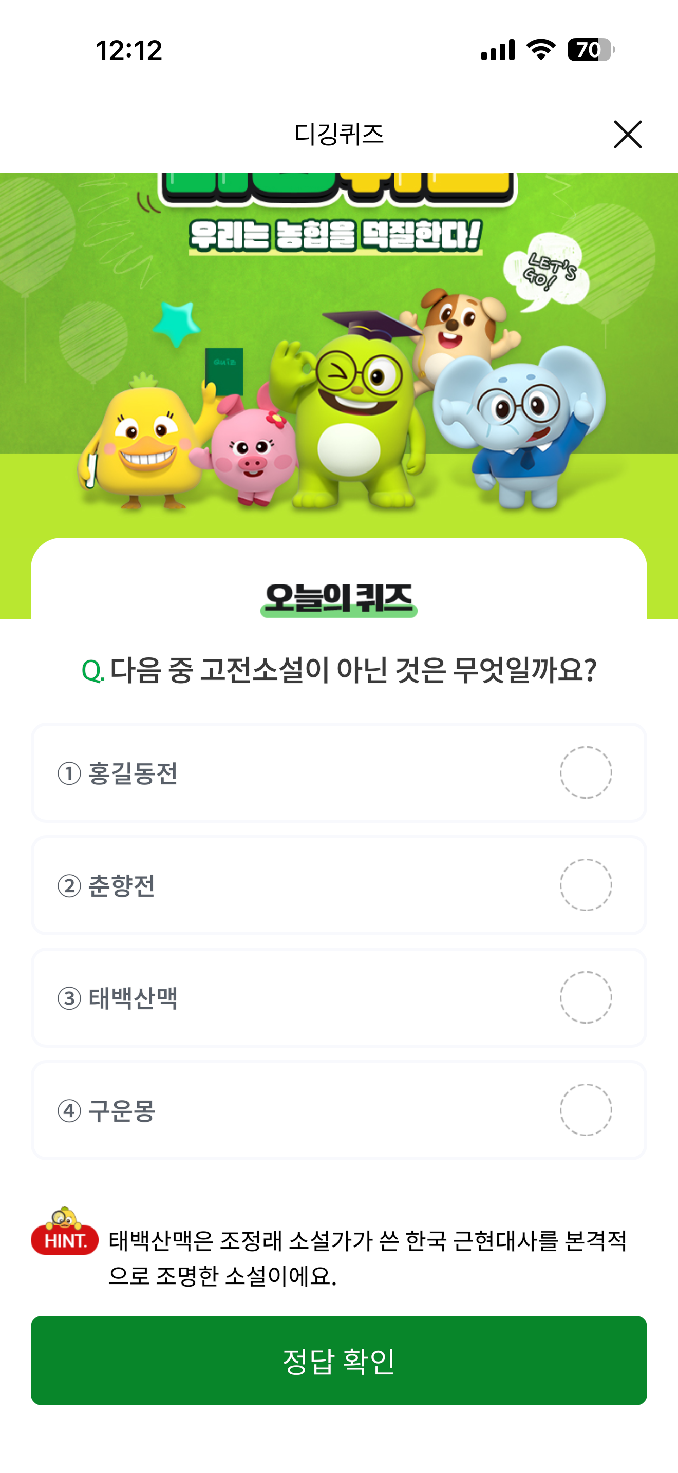 NH올원뱅크 디깅퀴즈 정답은 태백산맥 입니다