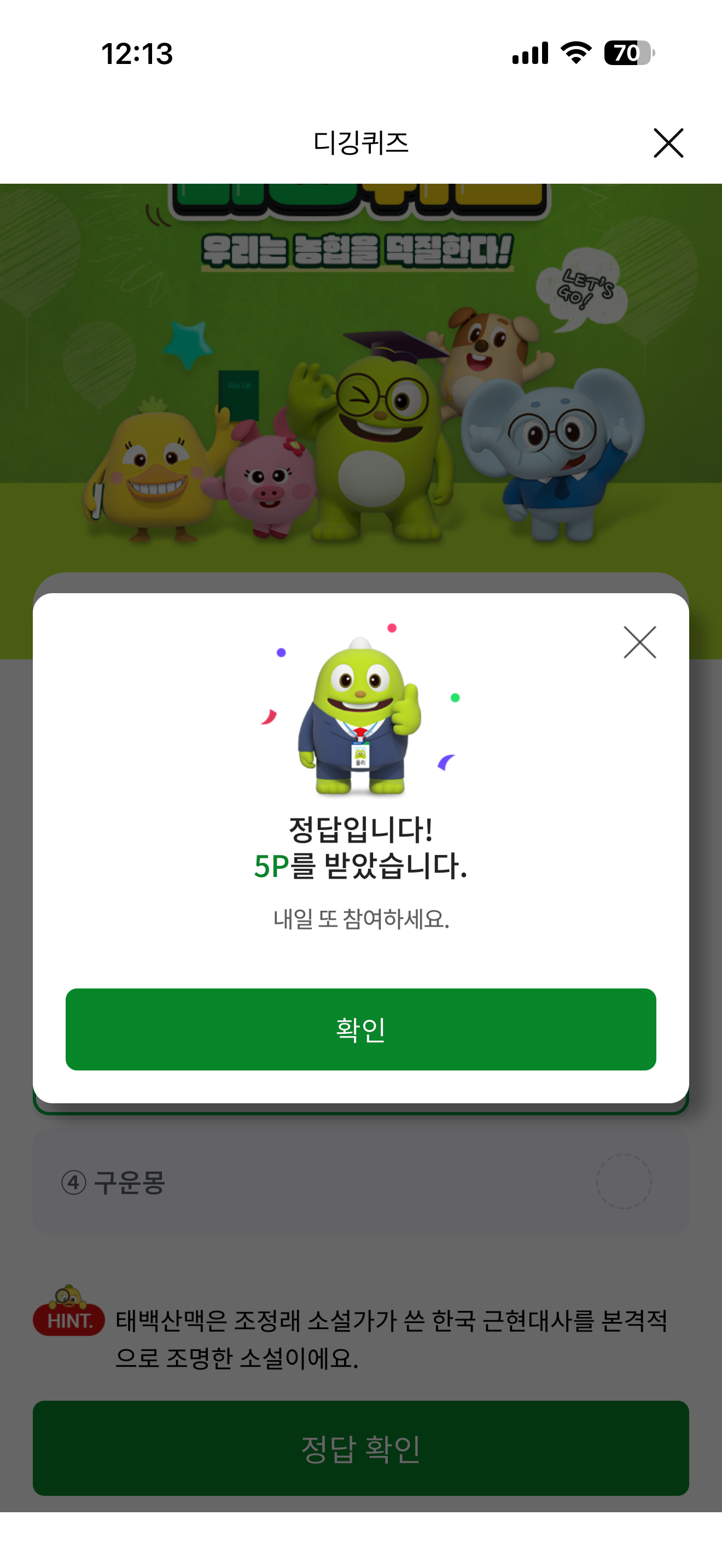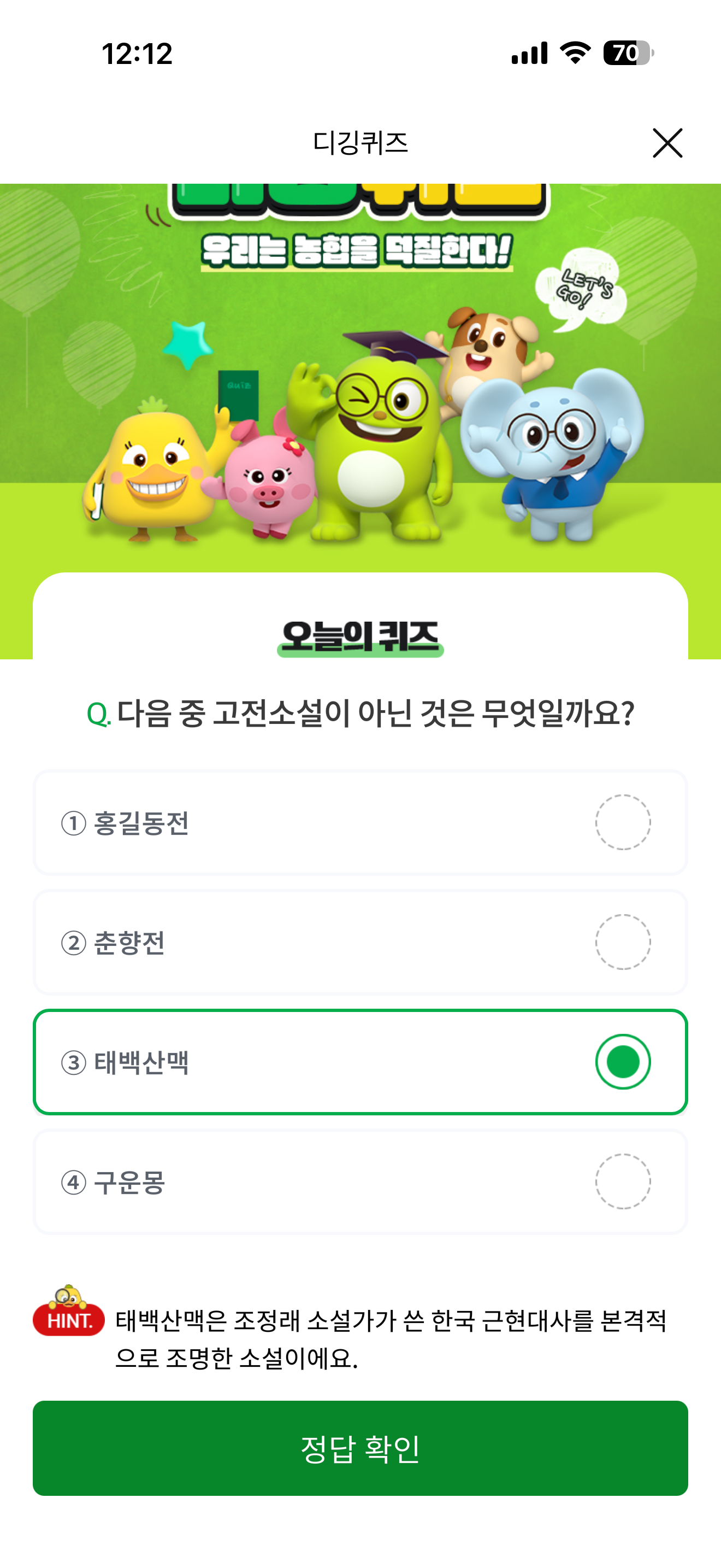 NH올원뱅크 디깅퀴즈 정답은 태백산맥 입니다