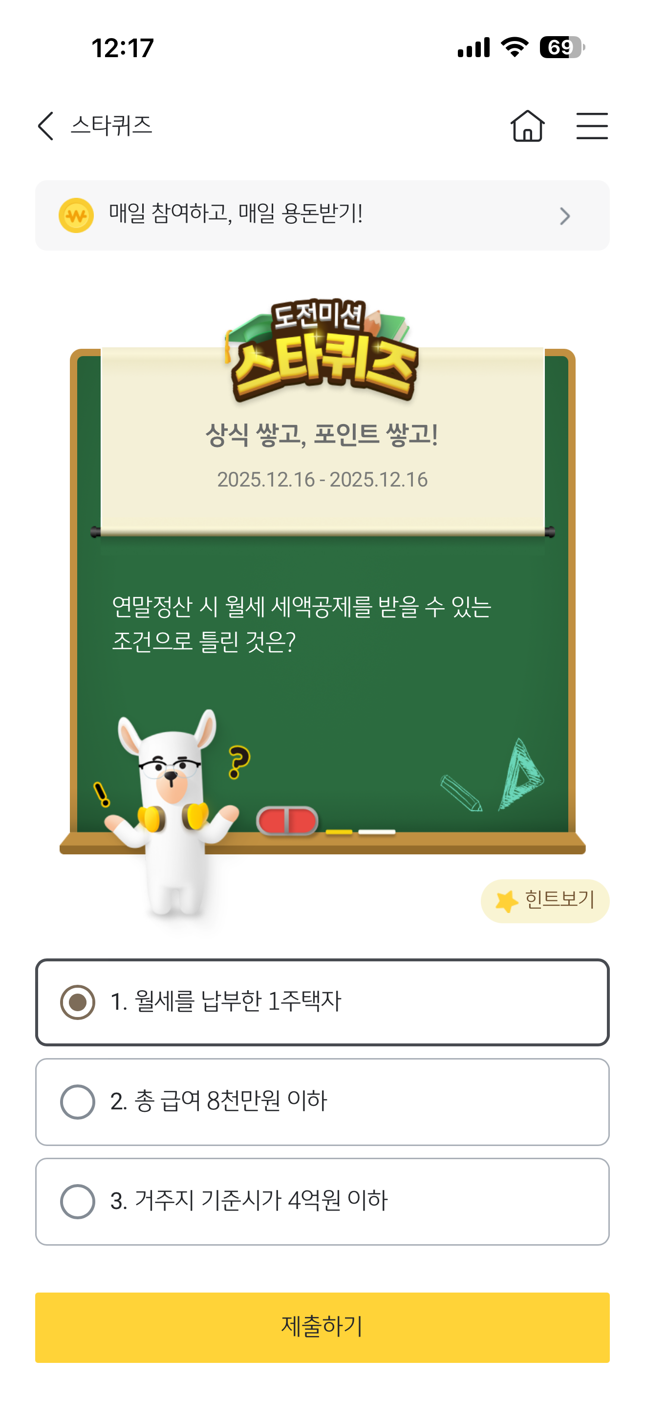 KB스타뱅킹 스타퀴즈 정답은 월세를 납부한 1주택자 입니다