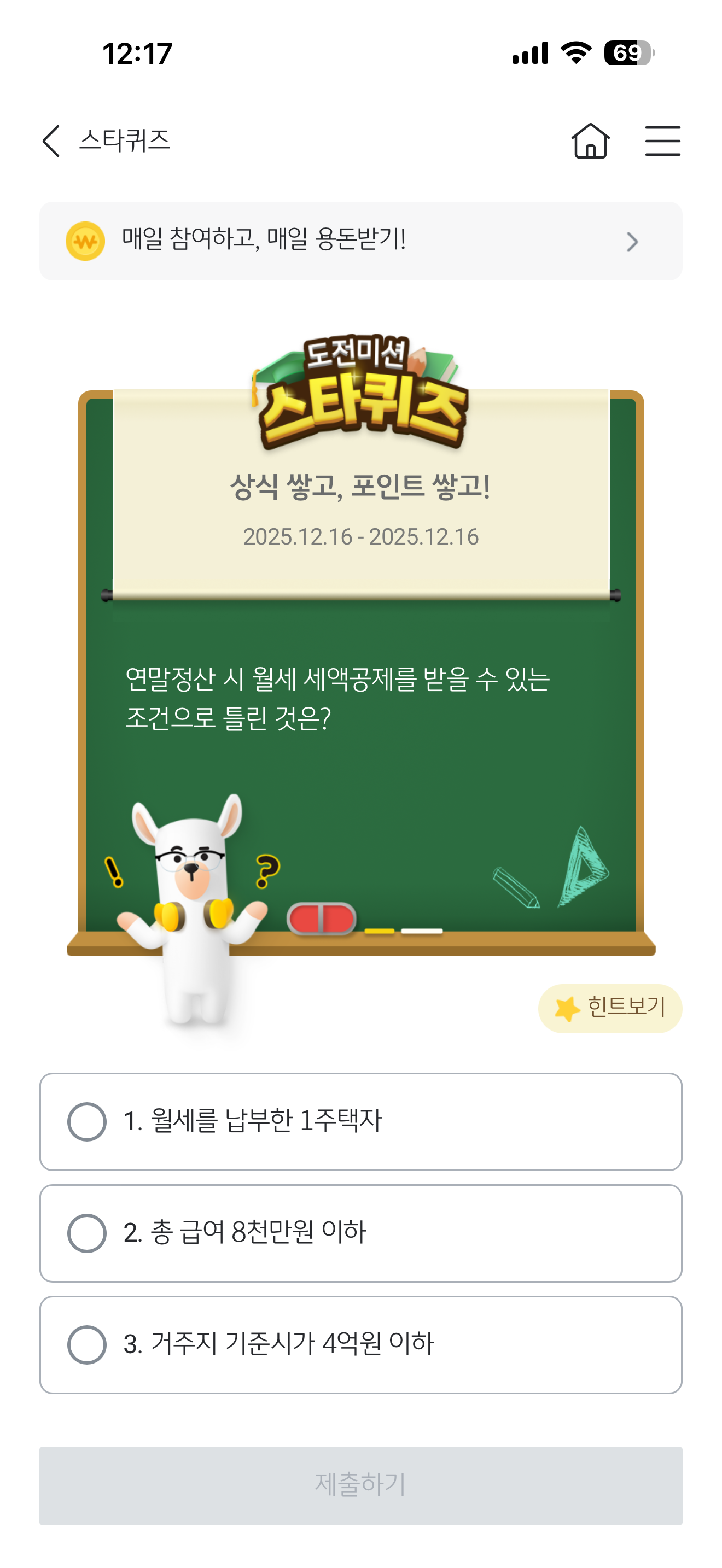 KB스타뱅킹 스타퀴즈 12월 16일 정답(연말정산 시 월세 세액공제를 받을 수 있는 조건으로 틀린 것은?)