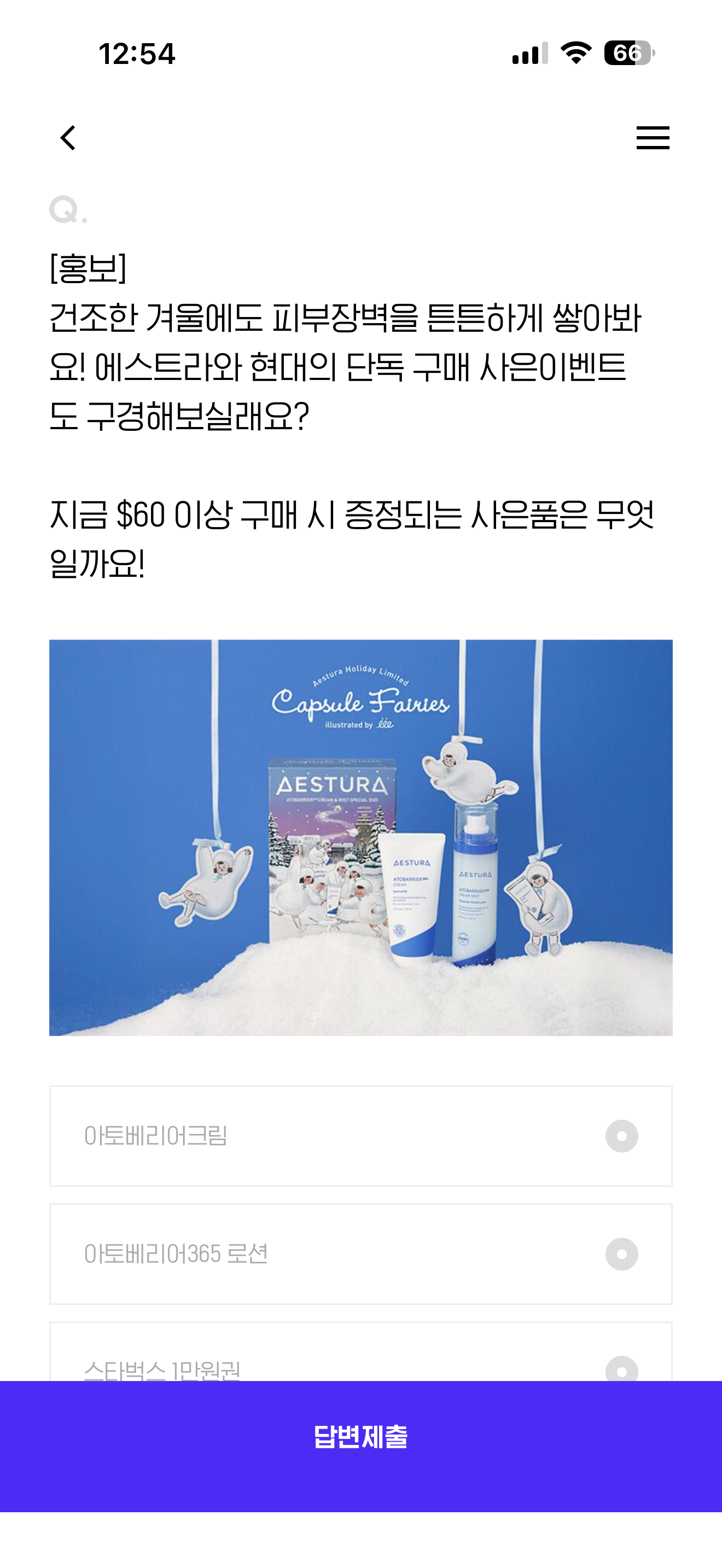 건조한 겨울에도 피부장벽을 튼튼하게 쌓아봐요! 에스트라와 현대의 단독 구매 사은이벤트도 구경해보실래요? 지금 $60 이상 구매 시 증정되는 사은품은 무엇일까요! 보기는 1. 아토베리어크림 2. 아토베리어365 로션 3. 스타벅스 1만원권 4. 에이시카365토너 PH4.5