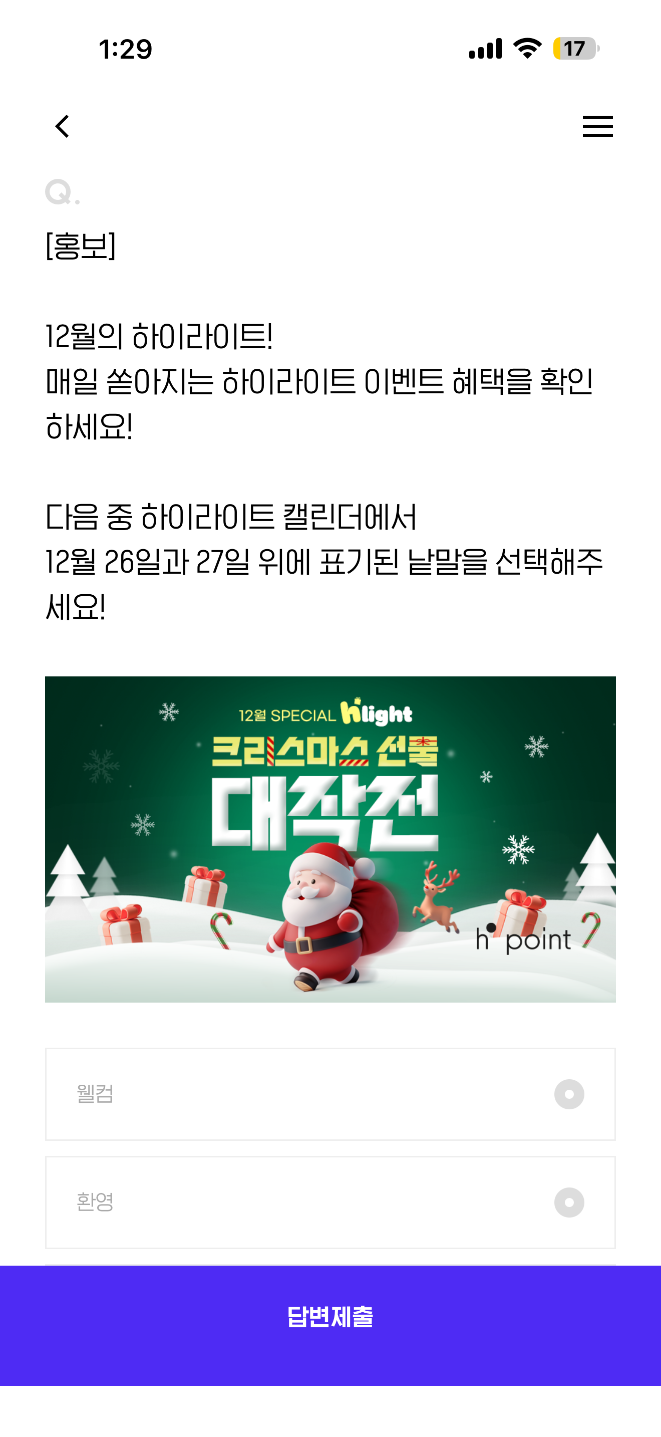 H포인트 퀴즈 12월 17일 문제입니다