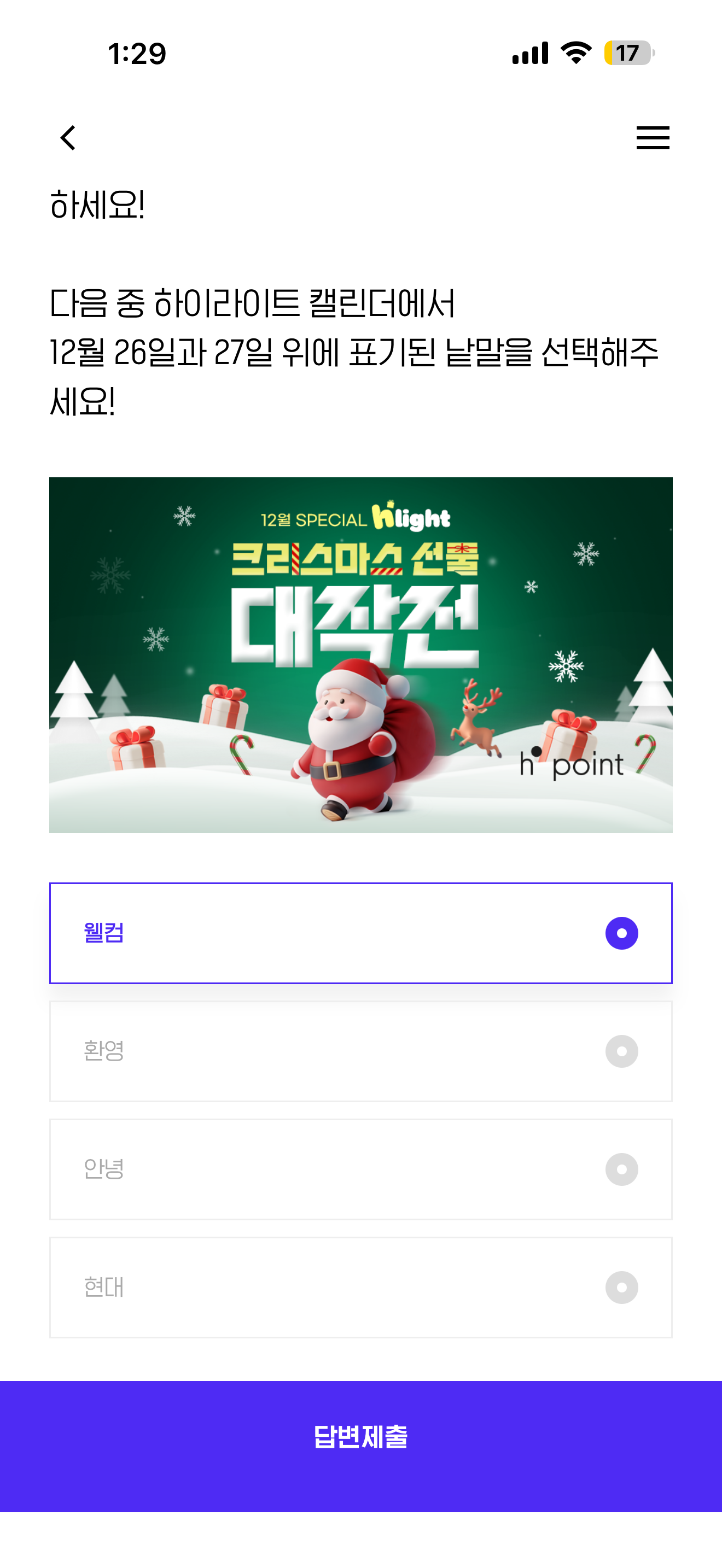12월의 하이라이트! 매일 쏟아지는 하이라이트 이벤트 혜택을 확인하세요! 다음 중 하이라이트 캘린더에서 12월 26일과 27일 위에 표기된 낱말을 선택해주세요! 보기는 1. 웰컴 2. 환영 3. 안녕 4. 현대 입니다