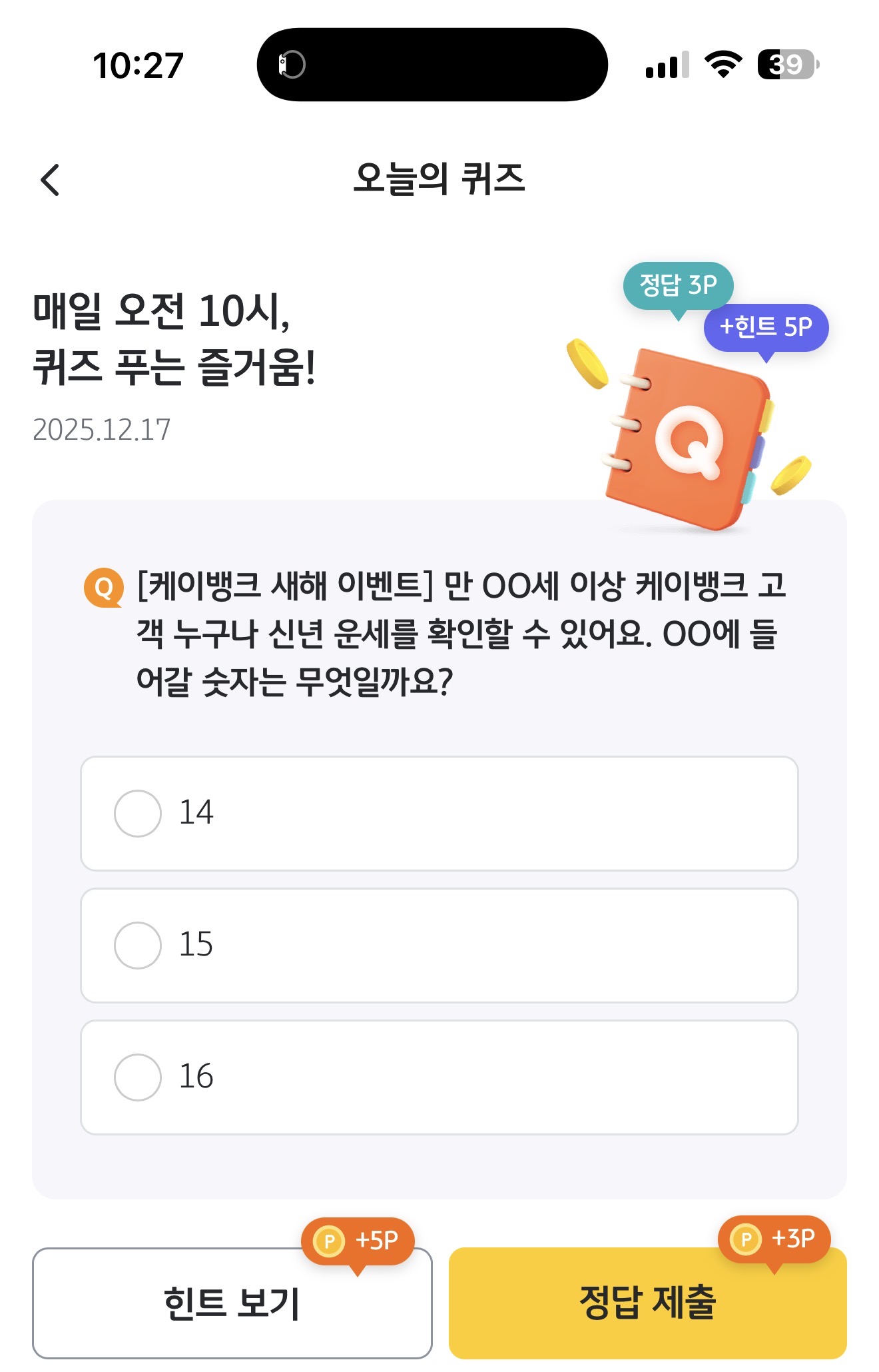 [케이뱅크 새해 이벤트] 만 OO세 이상 케이뱅크 고객 누구나 신년 운세를 확인할 수 있어. OO에 들어갈 숫자는 무엇일까요? 보기는 1. 14 2. 15 3. 16 입니다. 케이뱅크 새해 이벤트로 신년 운세 이벤트가 있습니다. 잘 참고해서 활용해 보세요