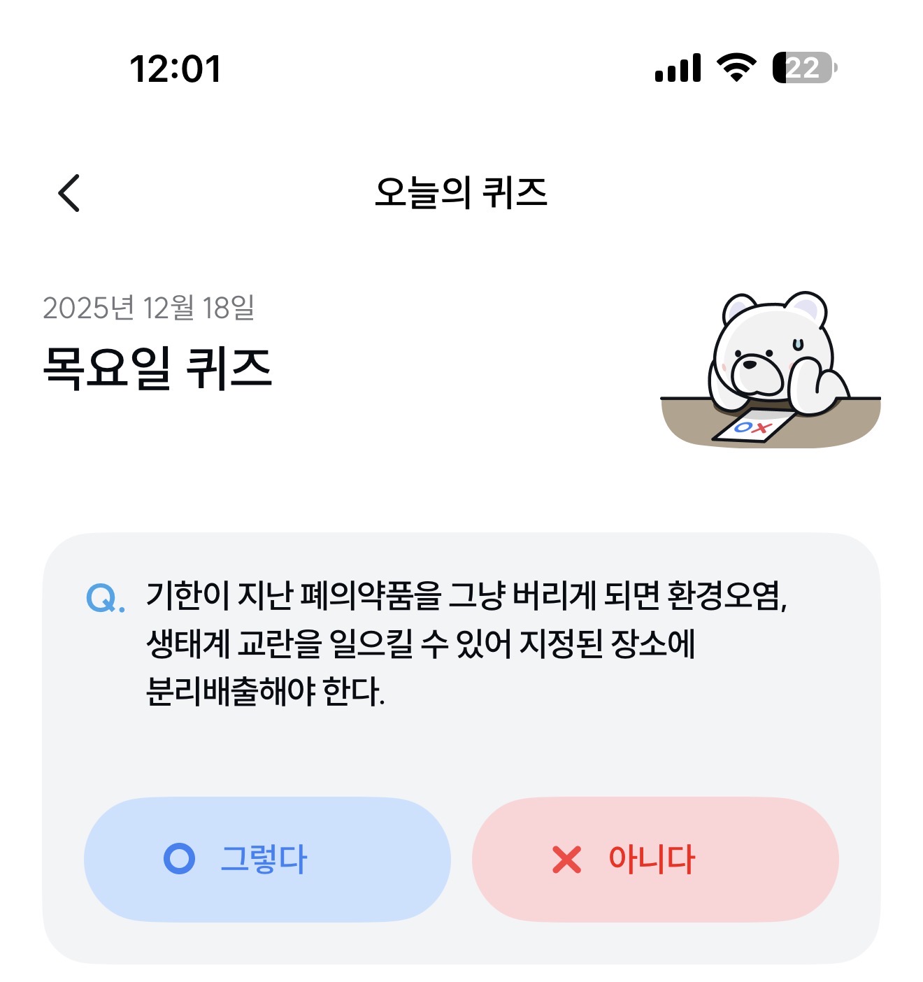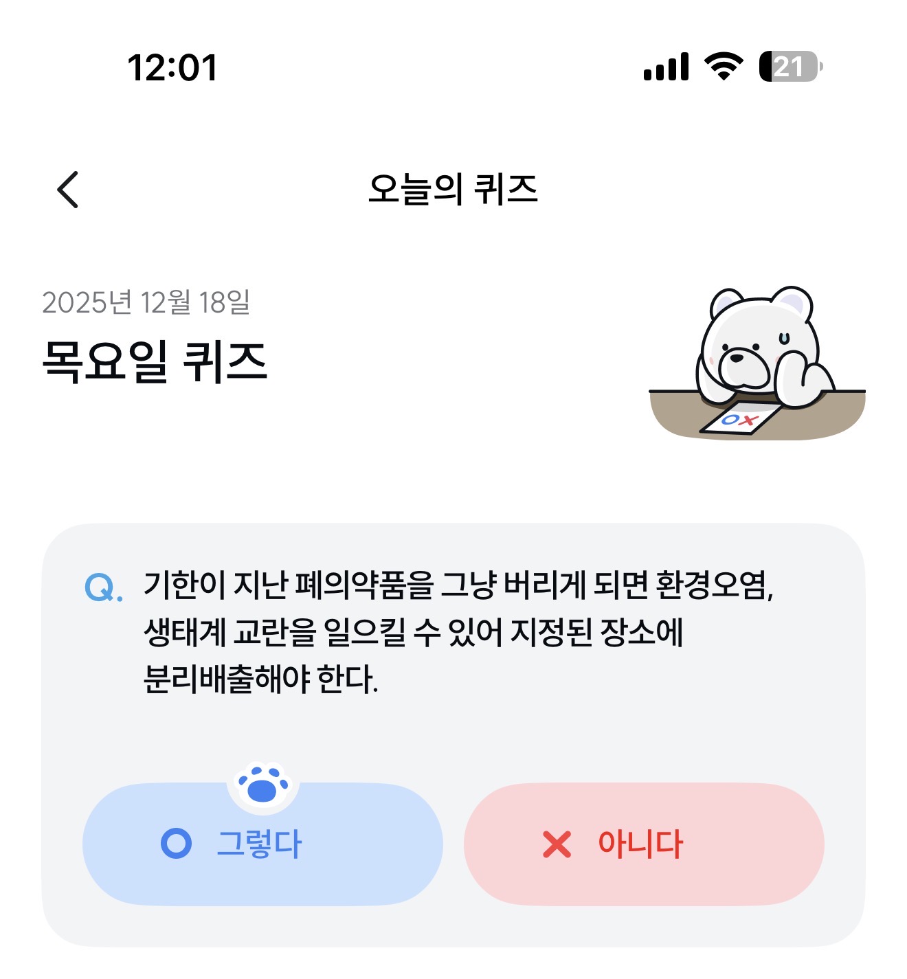 기한이 지난 폐의약품을 그냥 버리게 되면 환경오염, 생태계 교란을 일으킬 수 있어 지정된 장소에 분리배출해야 한다. 그렇다 아니다 선택하면 되는데요. 기한이 지난 의약품은 쓰레기에 버려도 될까요? 아니면 별도의 분리 수거해서 버려야 할까요? 참고해 두세요