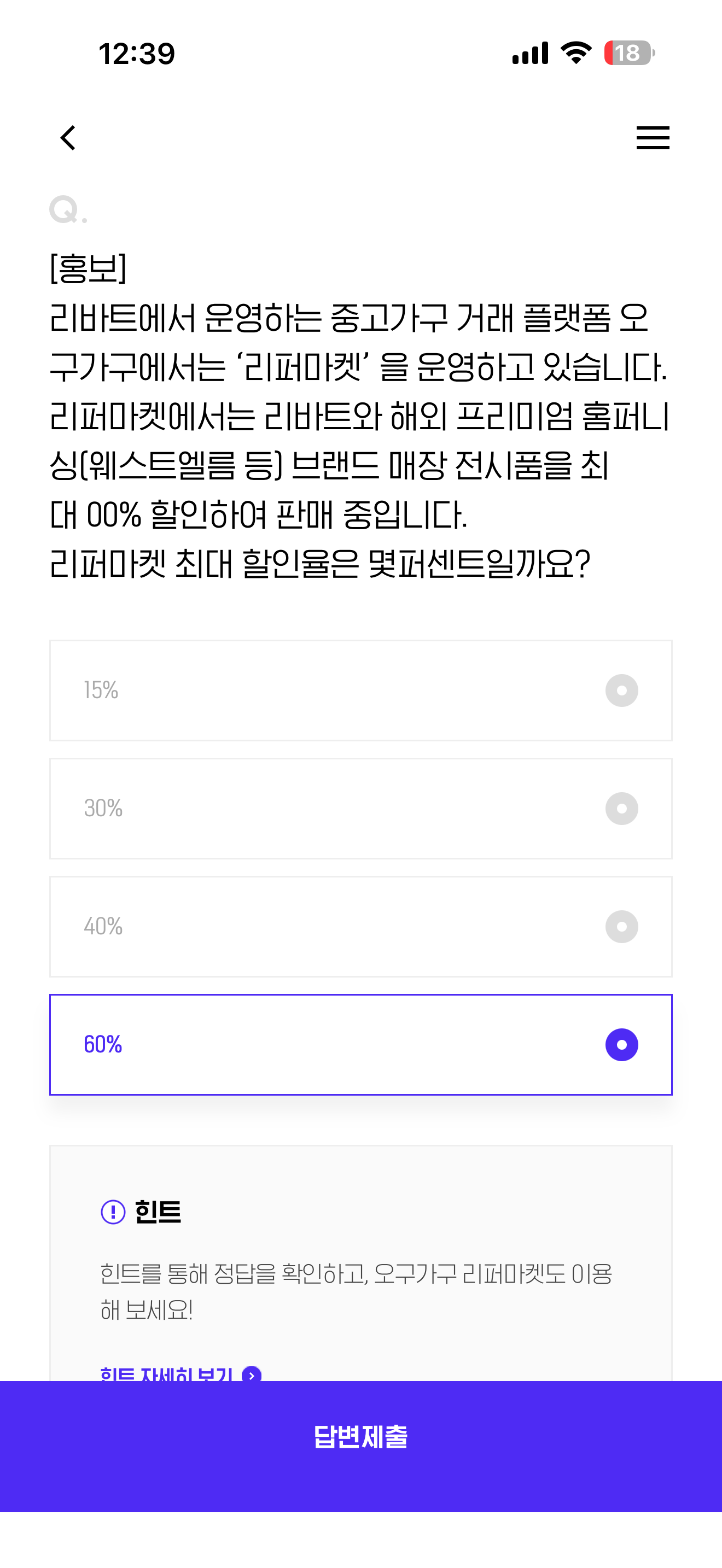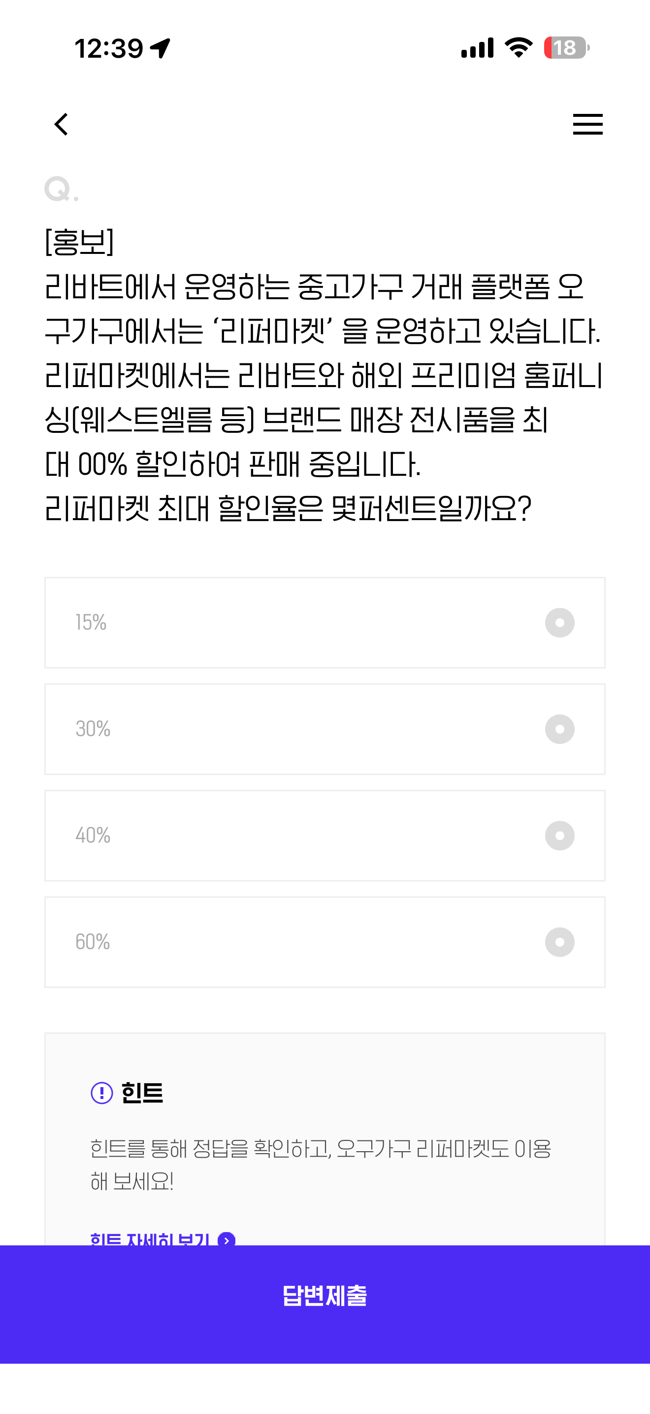 리바트에서 운영하는 중고가구 거래 플랫폼 오구가구에서는 '리퍼마켓' 을 운영하고 있습니다. 리퍼마켓에서는 리바트와 해외 프리미엄 홈퍼니싱(웨스트엘름 등) 브랜드 매장 전시품을 최대 00% 할인하여 판매 중입니다. 리퍼마켓 최대 할인율은 몇퍼센트일까요?