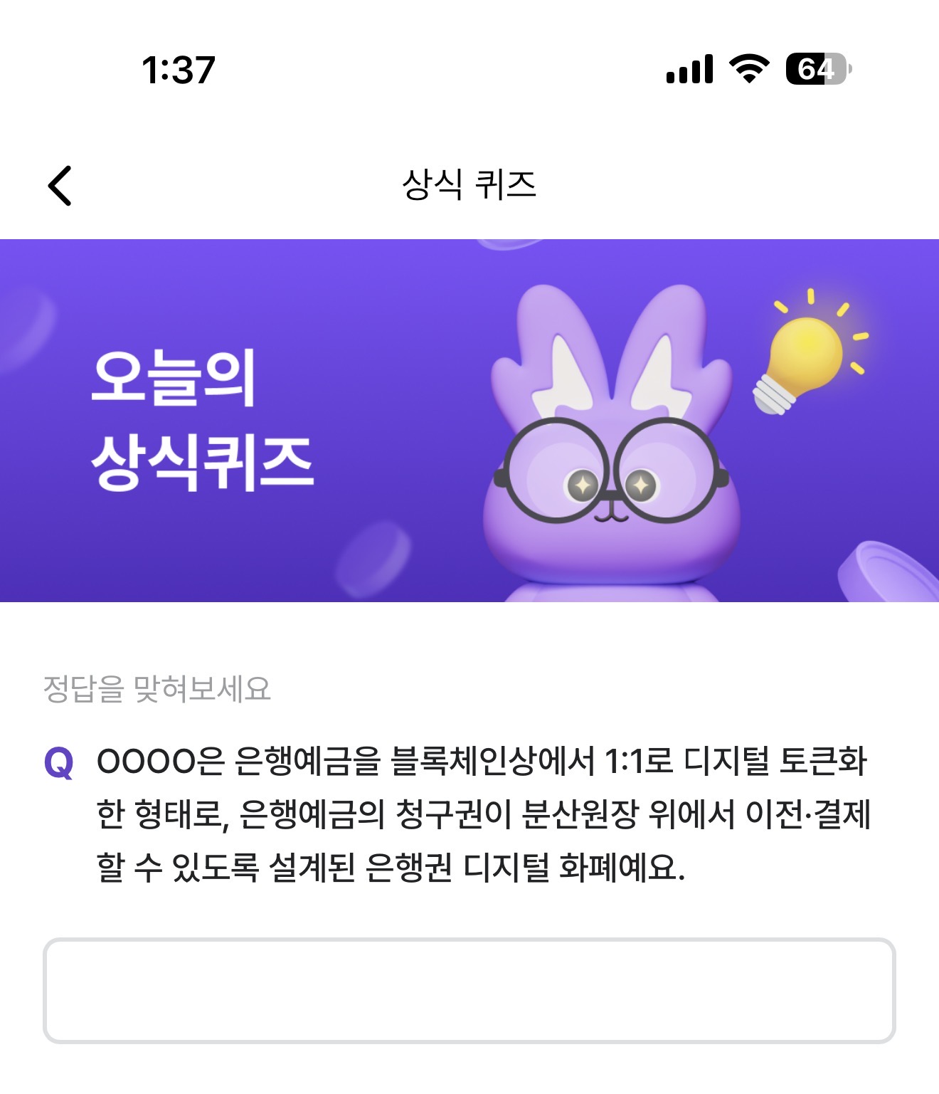 OOOO은 은행예금을 블록체인상에서 1:1로 디지털 토큰화한 형태로, 은행예금의 청구권이 분산원장 위에서 이전 결제할 수 있도록 설계된 은행권 디지털 화폐예요. 주관식 퀴즈인데요.