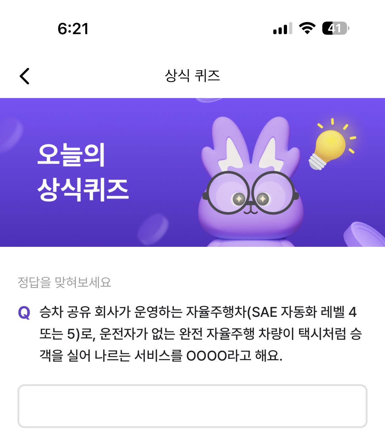 비트버니 오늘의 퀴즈 12월 20일 ㄹㅂㅌㅅ 정답(승차 공유 회사가 운영하는 자율주행차(SAE 자동화 레벨 4 또는 5)로, 운전자가 없는 완전 자율주행 차량이 택시처럼 승객을 실어 나르는 서비스를 OOOO라고 해요)