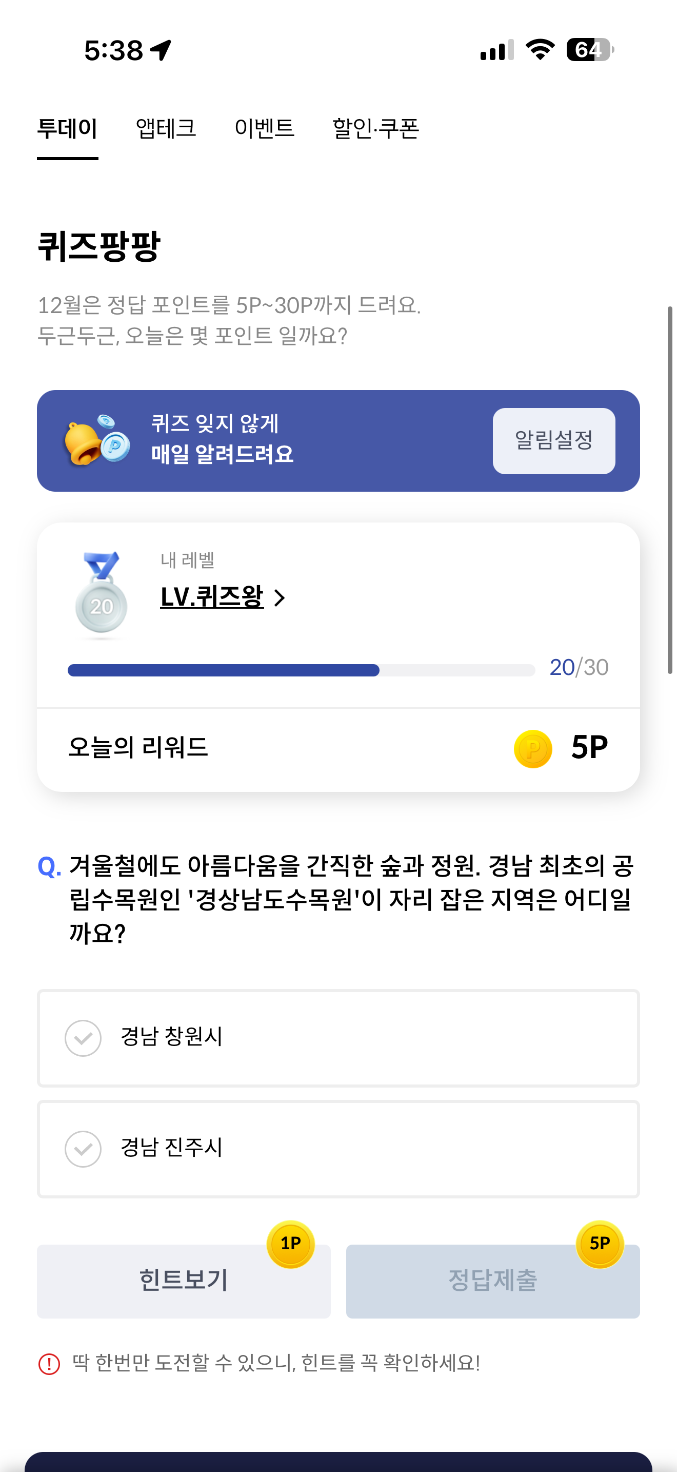 신한카드 퀴즈팡팡 정답은 경남 진주시 입니다