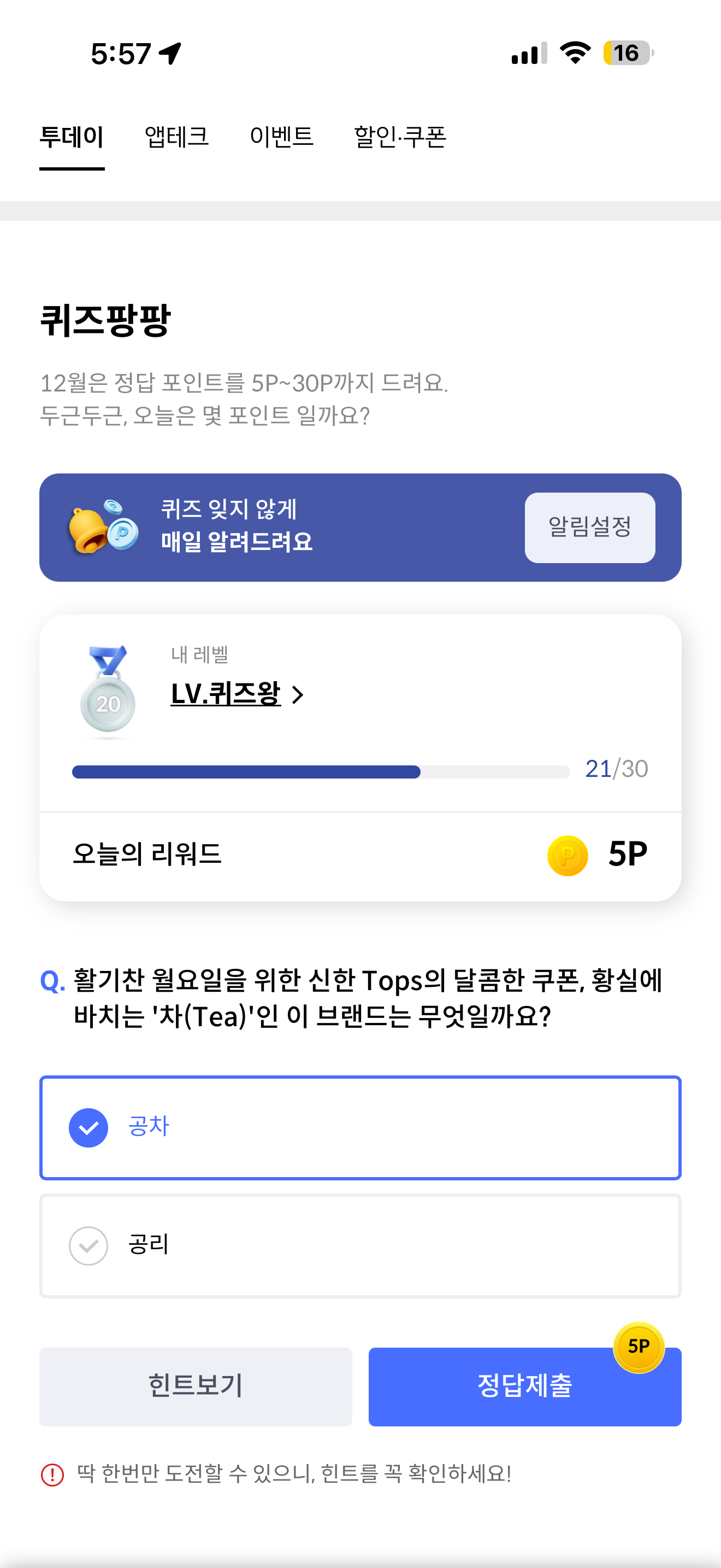 활기찬 월요일을 위한 신한 Tops의 달콤한 쿠폰, 황실에 바치는 '차(Tea)'인 이 브랜드는 무엇일까요? 보기는 1. 공차 2. 공리 입니다. 활기찬 월요일을 위한 달콤한 쿠폰이 제공됩니다. 잘 참고해서 활용해 보세요