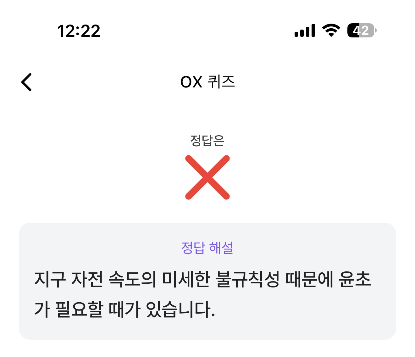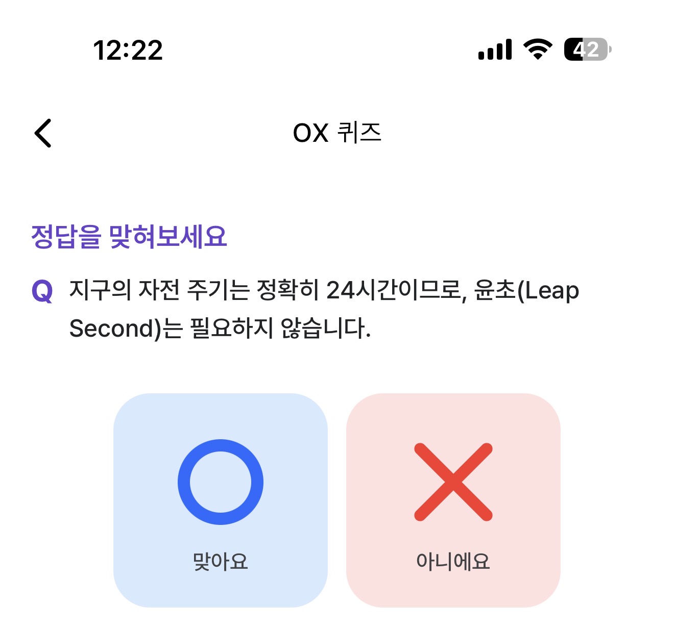 지구의 자전 주기는 정확히 24시간이므로, 윤초(Leap Second)는 필요하지 않습니다 O, X 퀴즈인데요. 지구의 자전 주기는 뭘까요? 24시간으로 우리의 시간은 나눠져 있죠. 과연 온초는 필요하지 않을까요?