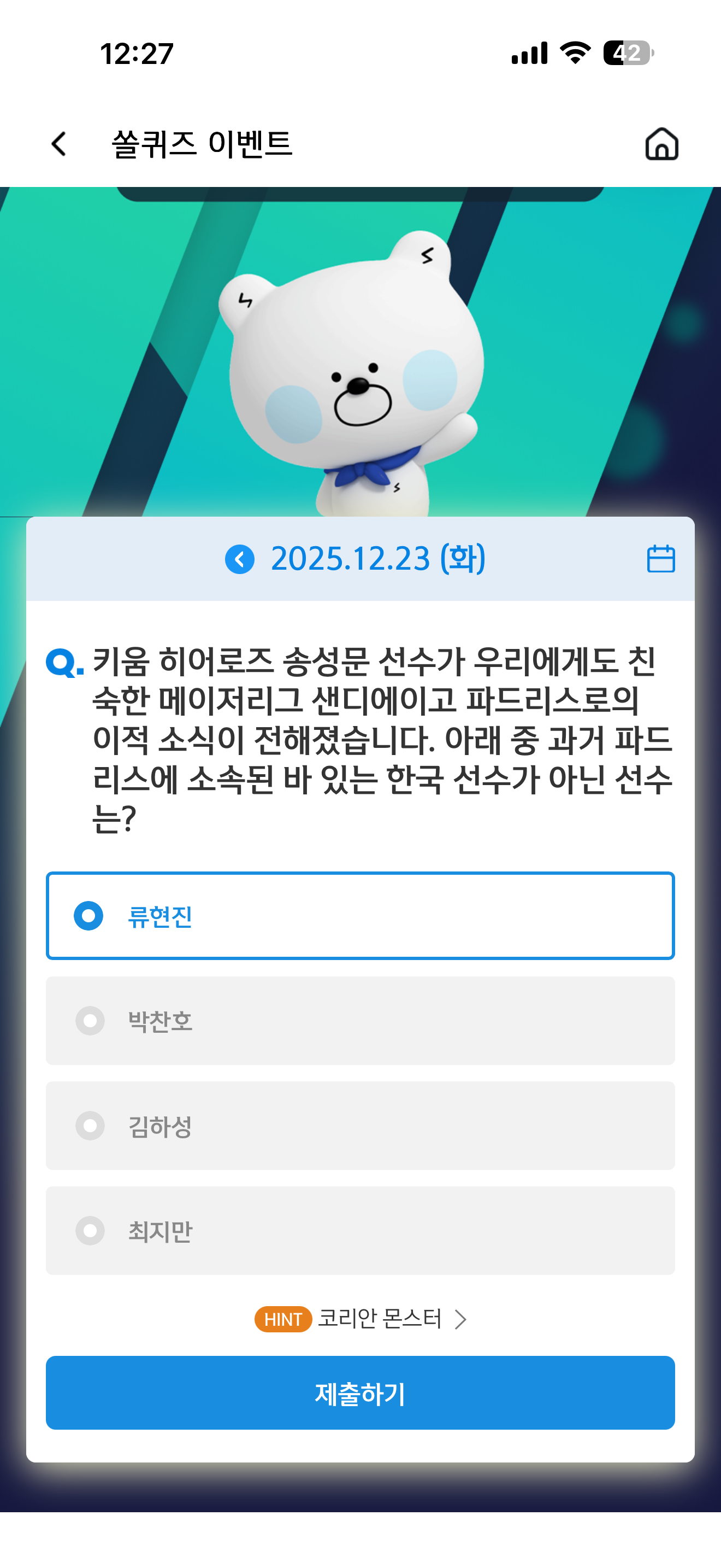 신한 슈퍼SOL 야구/상식 쏠퀴즈 정답은 류현진 입니다