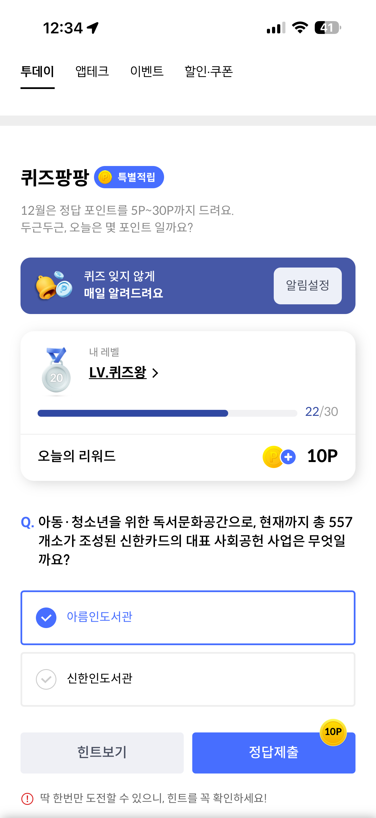 신한카드 퀴즈팡팡 정답은 아름인도서관 입니다