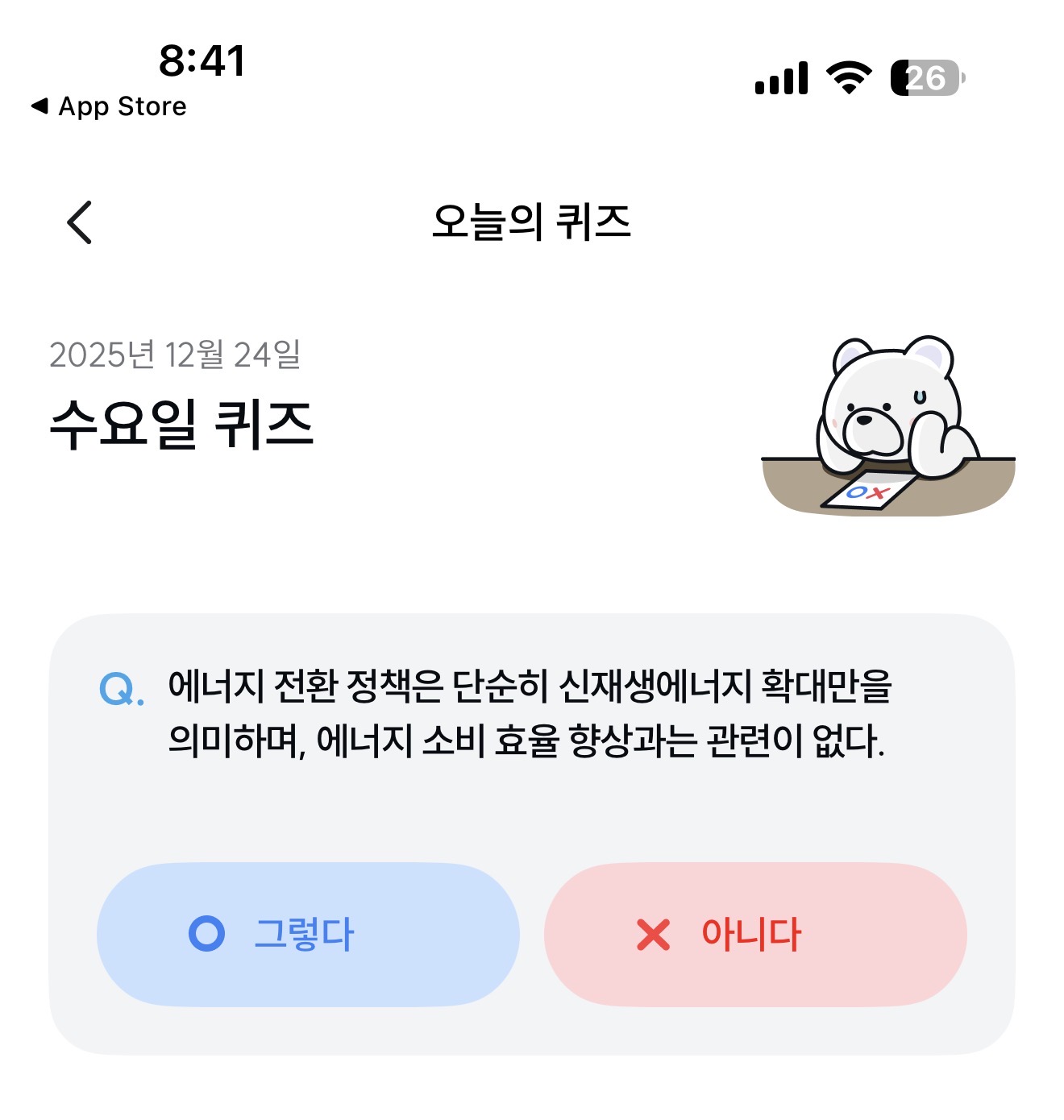 기후행동 기회소득 오늘의 퀴즈 12월 24일 정답(에너지 전환 정책은 단순히 신재생에너지 확대만을 의미하며, 에너지 소비 효율 향상과는 관련이 없다)