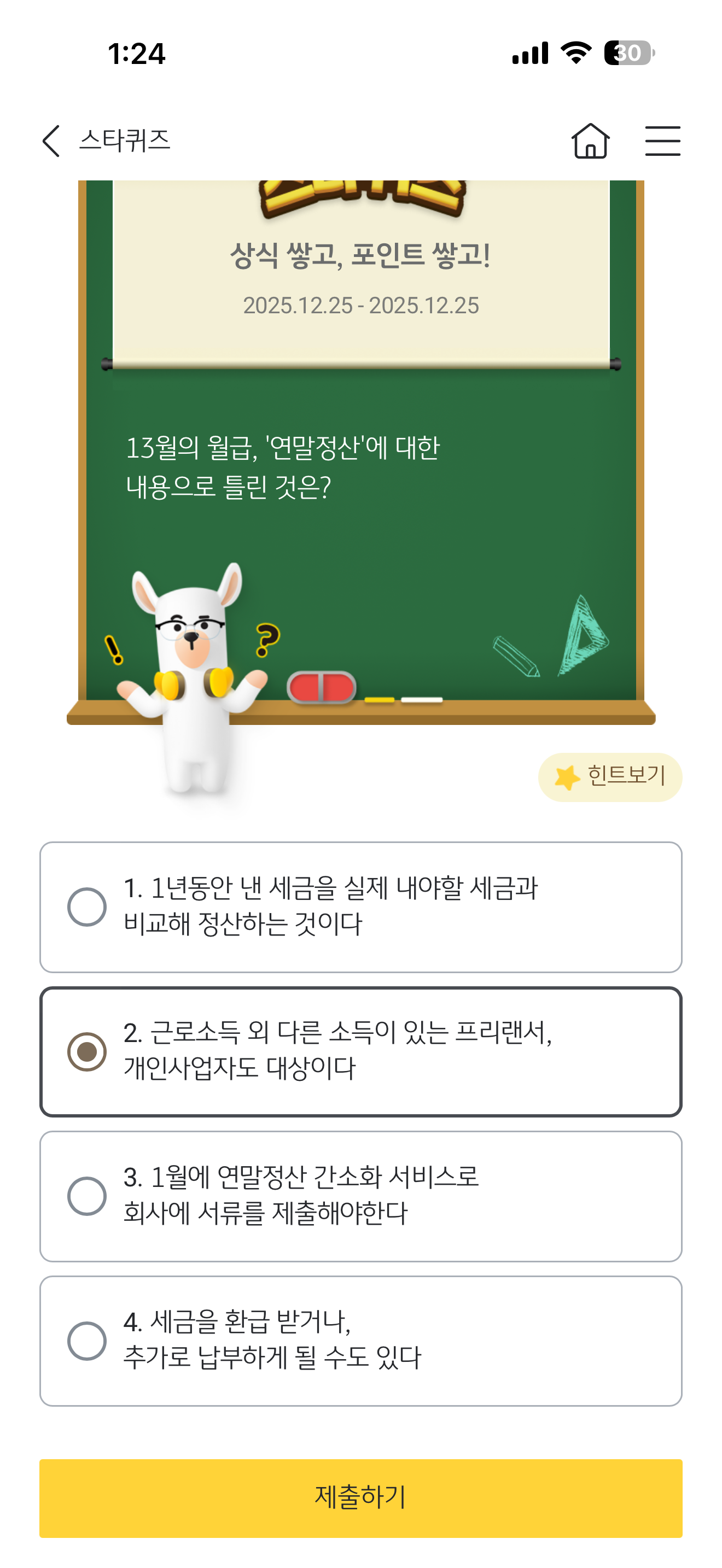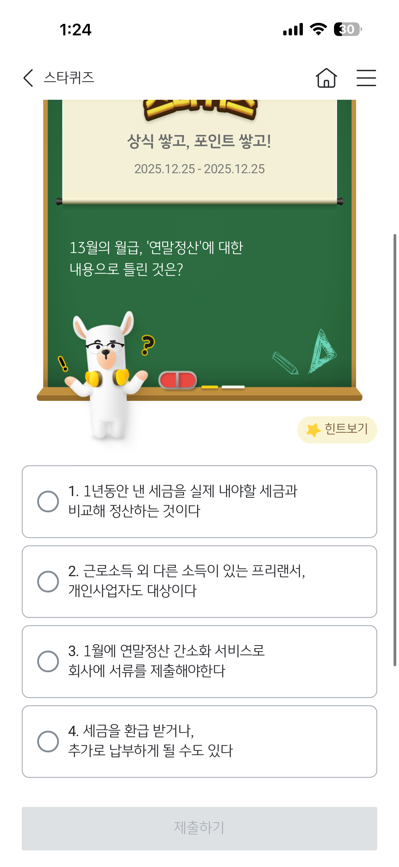 13월의 월급, '연말정산'에 대한 내용으로 틀린 것은? 보기는 1. 1년동안 낸 세금을 실제 내야할 세금과 비교해 정산하는 것이다 2. 근로소득 외 다른 소득이 있는 프리랜서, 개인사업자도 대상이다 3. 1월에 연말정산 간소화 서비스로 회사에 서류를 제출해야한다 4. 세금을 환급 받거나, 추가로 납부하게 될 수도 있다