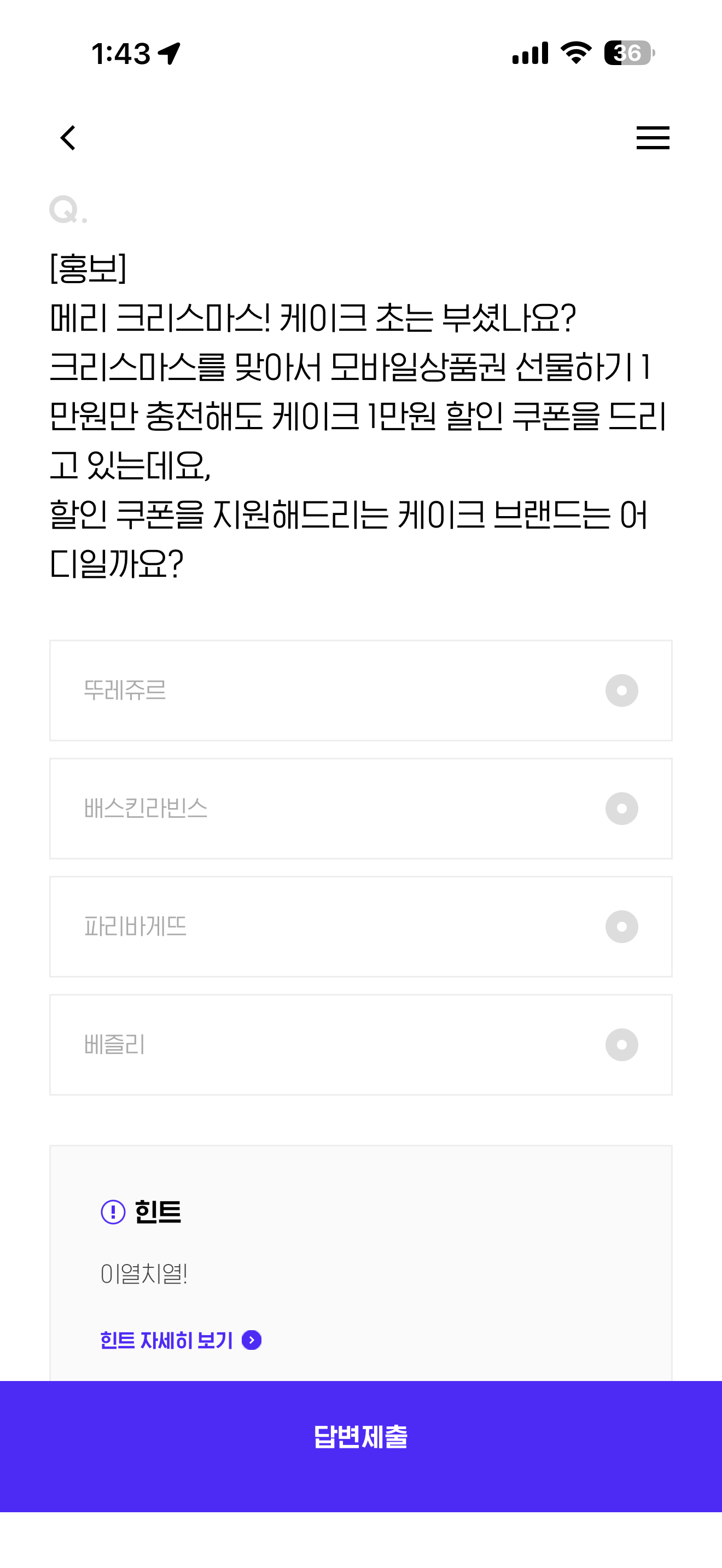메리 크리스마스! 케이크 초는 부셨나요? 크리스마스를 맞아서 모바일상품권 선물하기 1만원만 충전해도 케이크 1만원 할인 쿠폰을 드리고 있는데요, 할인 쿠폰을 지원해드리는 케이크 브랜드는 어디일까요? 보기는 1. 뚜레쥬르 2. 배스킨라빈스 3. 파리바게뜨 4. 베즐리 입니다