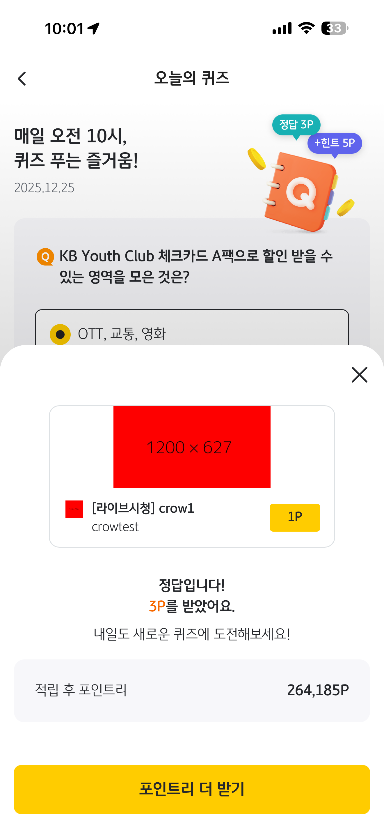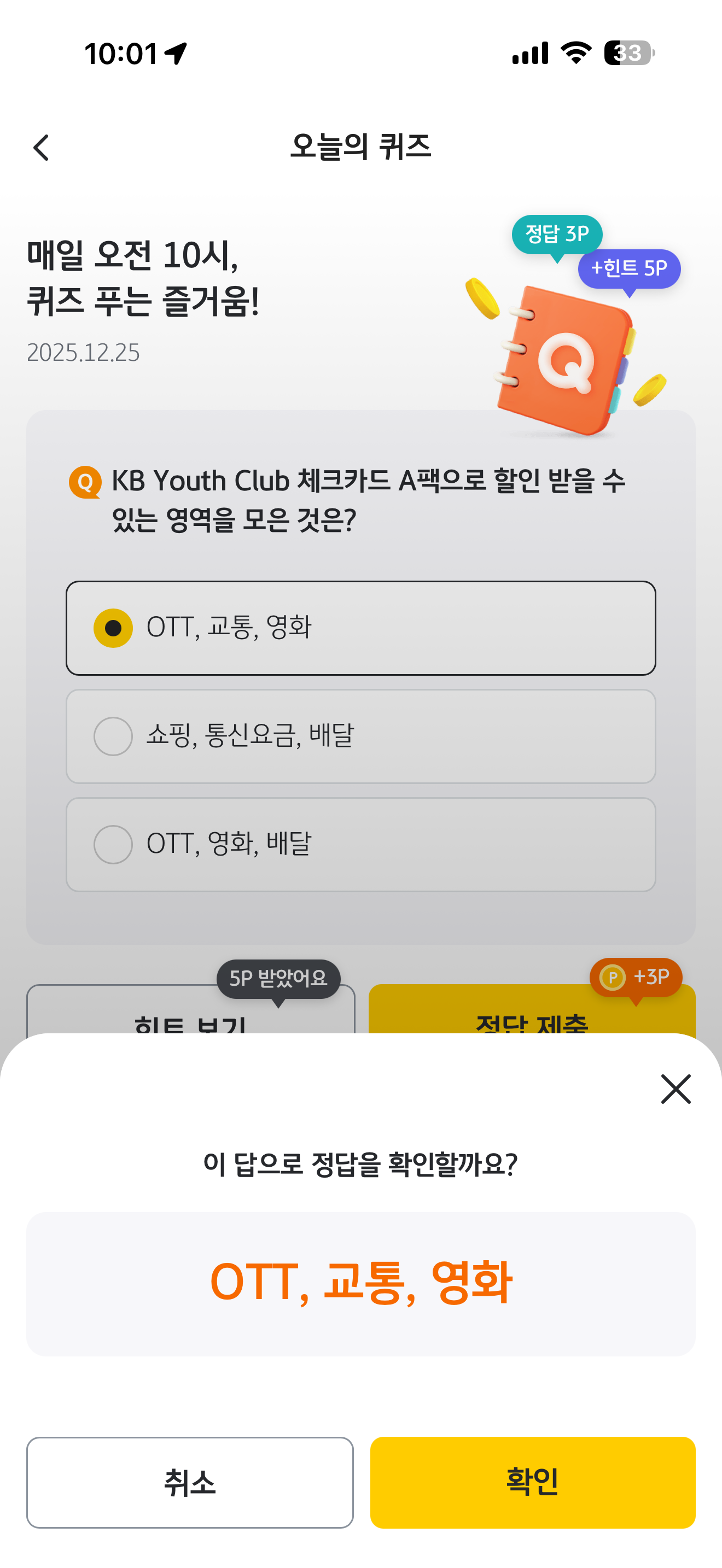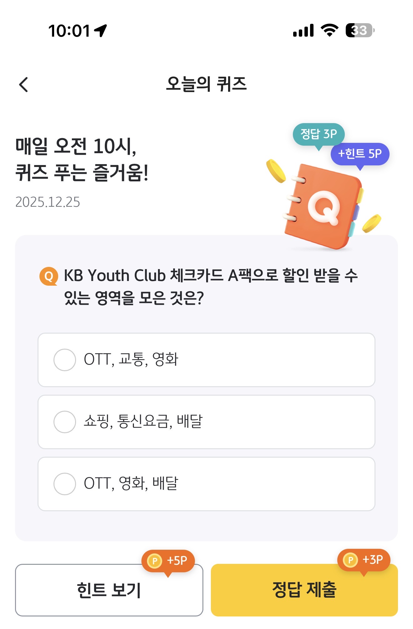 KB Pay 오늘의 퀴즈 정답은 OTT, 교통, 영화 입니다