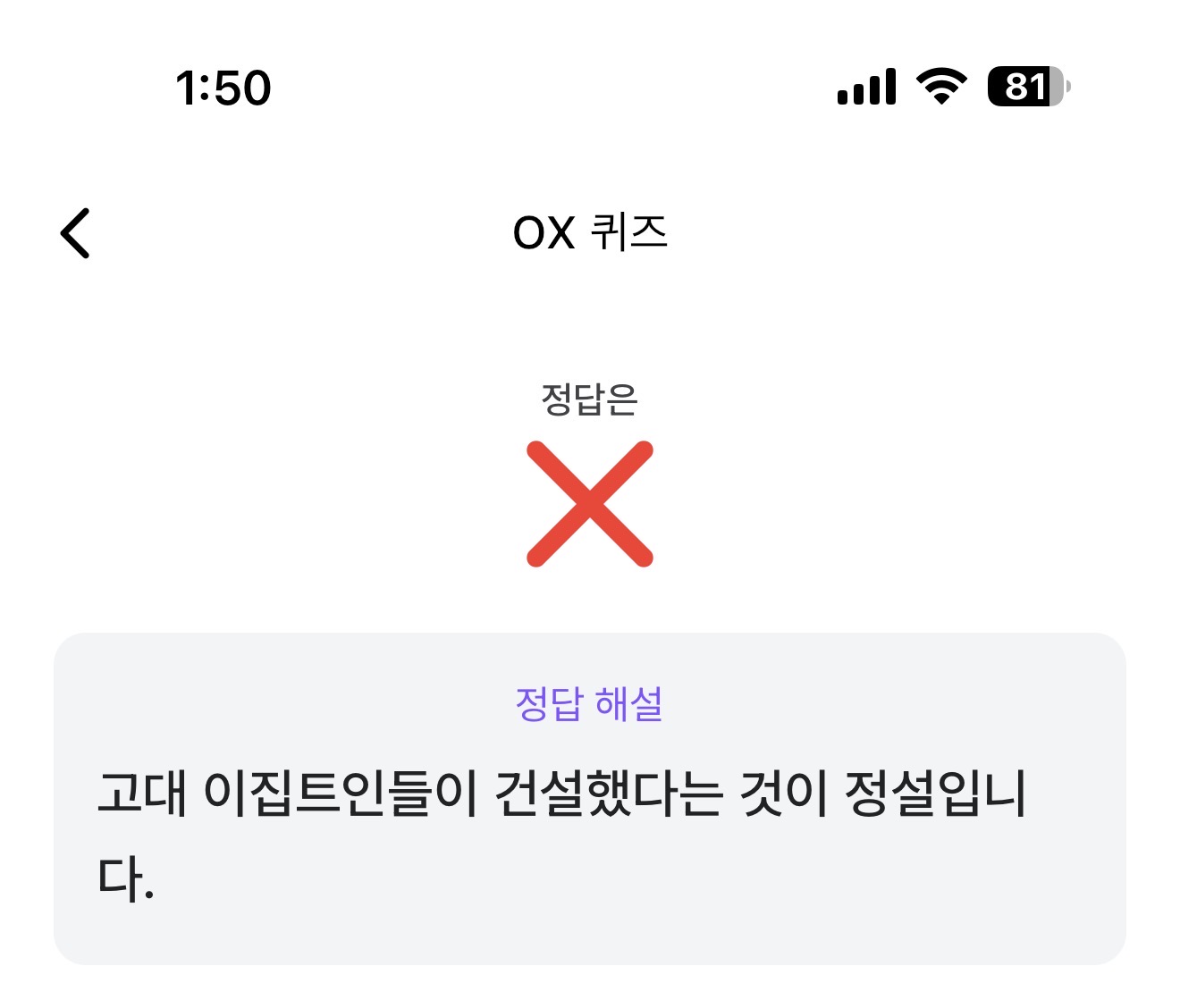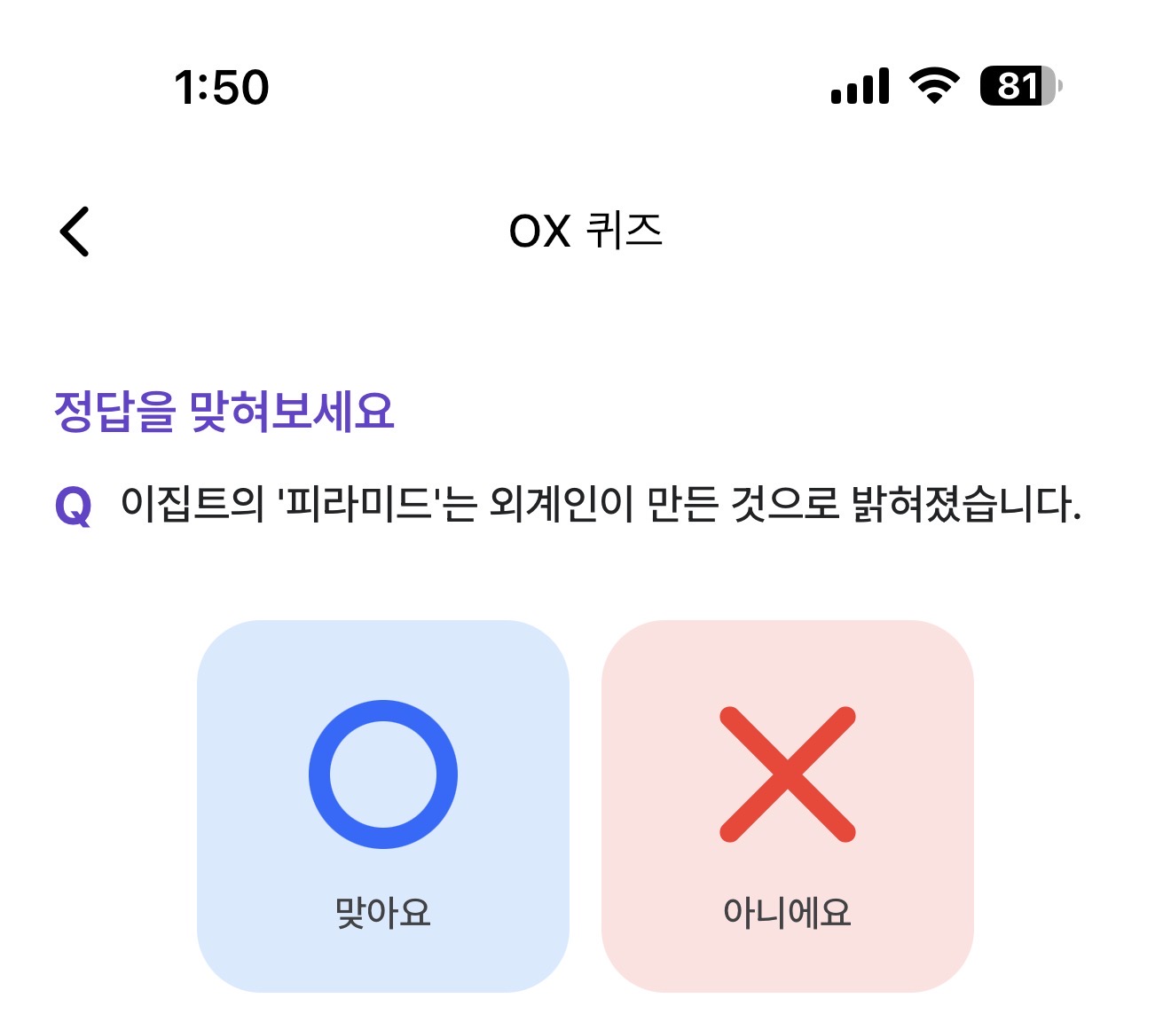 이집트의 '피라미드'는 외계인이 만든 것으로 밝혀졌습니다. O, X 퀴즈인데요. 이집트의 피라미드는 너무나 거대한 모습에 저게 과연 사람이 만들었을까 싶을 정도로 미스테리한 건축물이라는 평가를 받고 있습니다. 그래서 외계인설도 돌았었죠