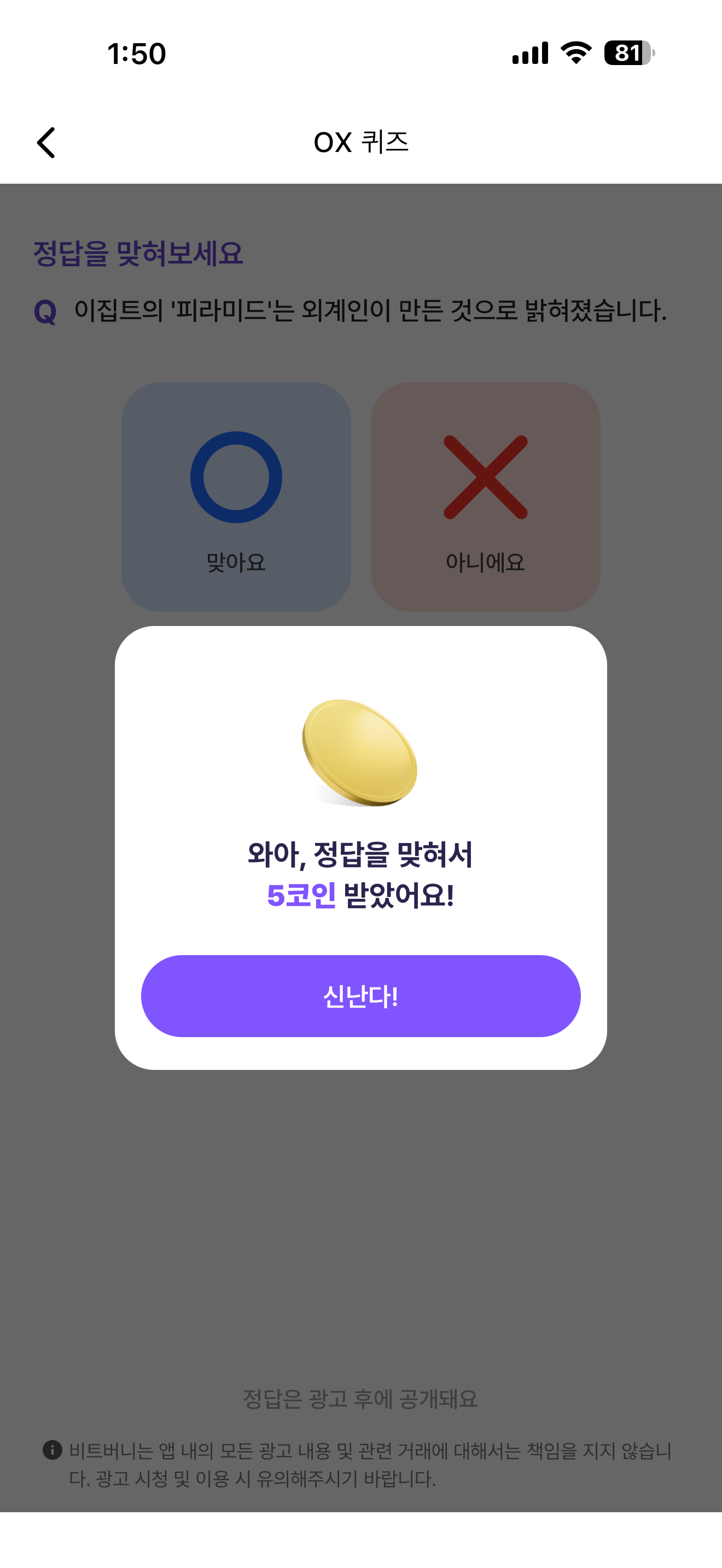 비트버니 오늘의 퀴즈 OX 퀴즈 정답은 X 입니다