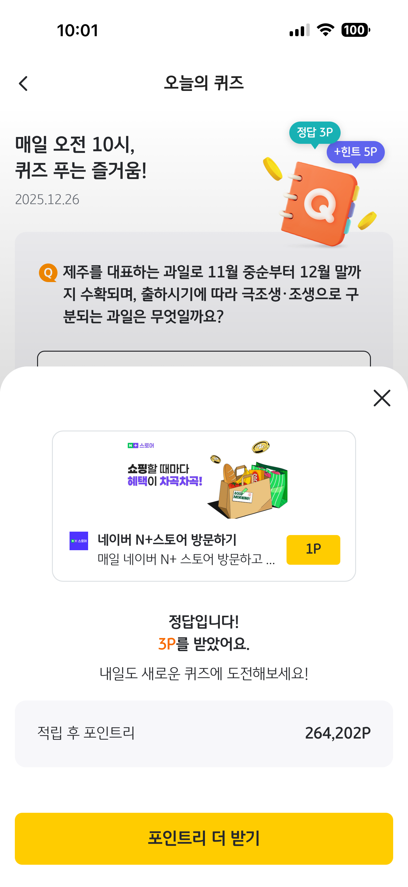 | 신한카드 퀴즈팡팡 12월 26일 정답(눈이 내리면 더 아름다운 곳. 무심원, 머루와인동굴, 덕유산, 태권도원 등이 있는 곳은 어디일까요?) (0) | 2025.12.26 |
