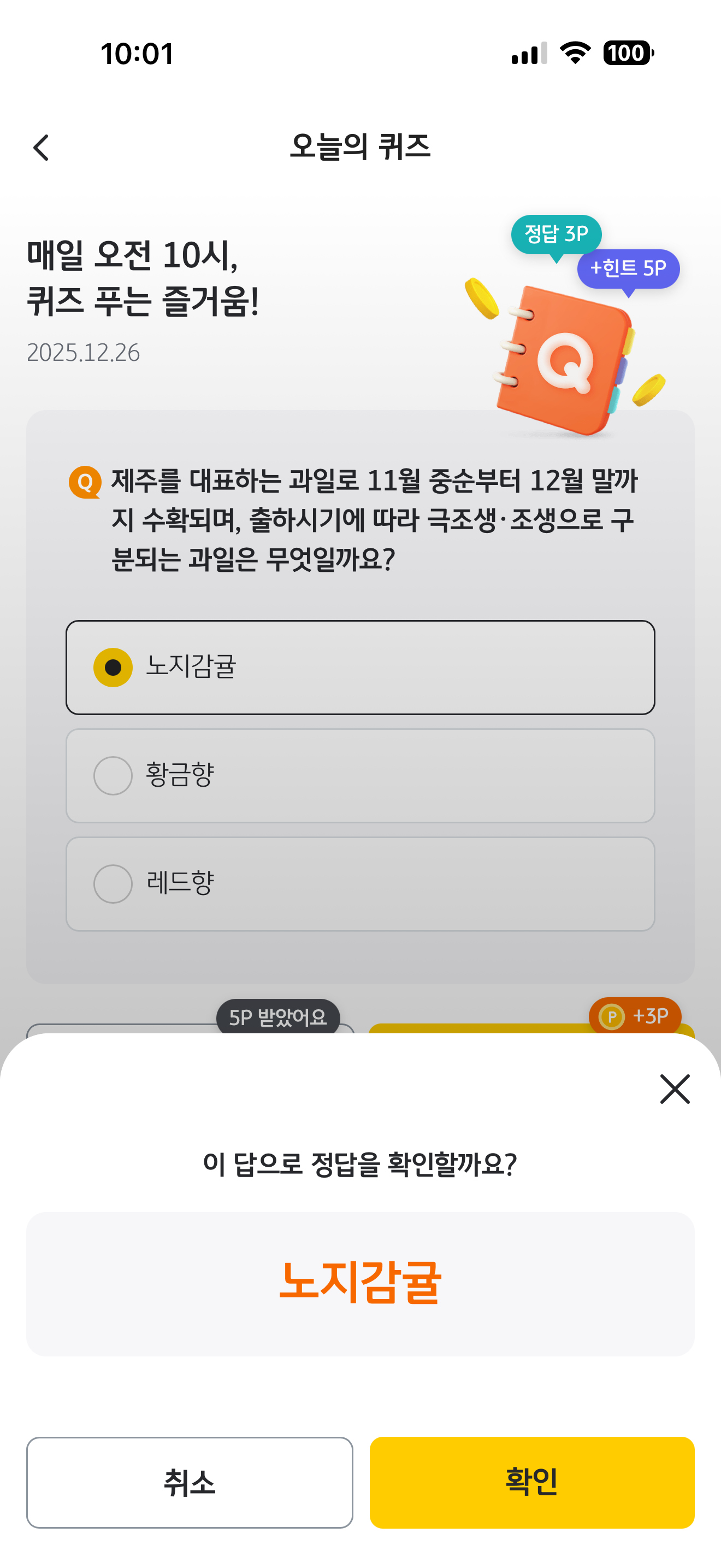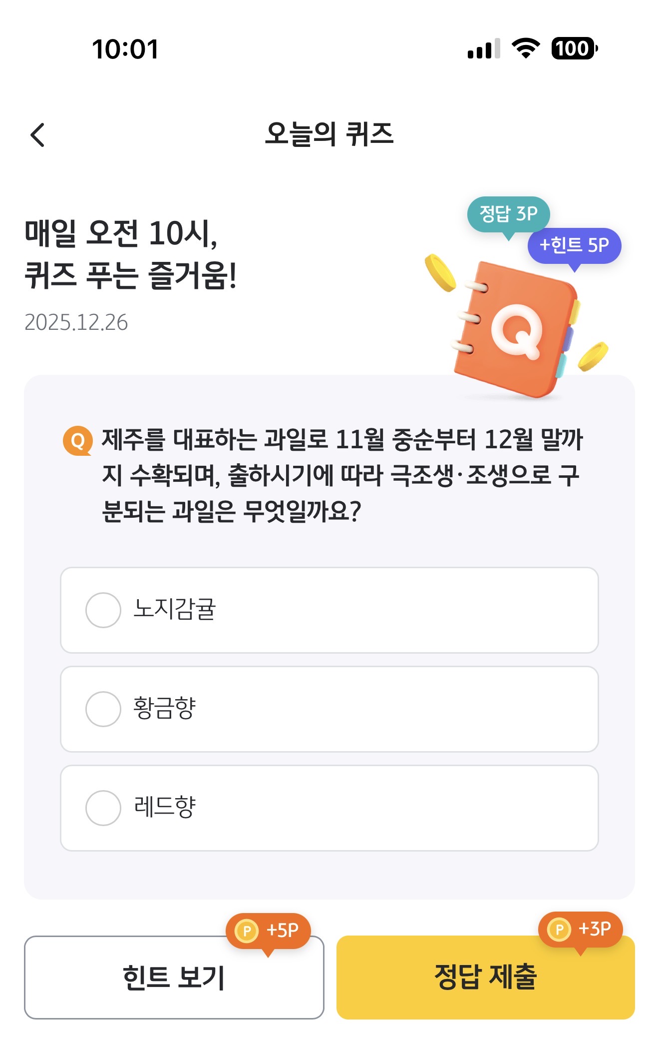KB Pay 오늘의 퀴즈 정답은 노지감귤 입니다