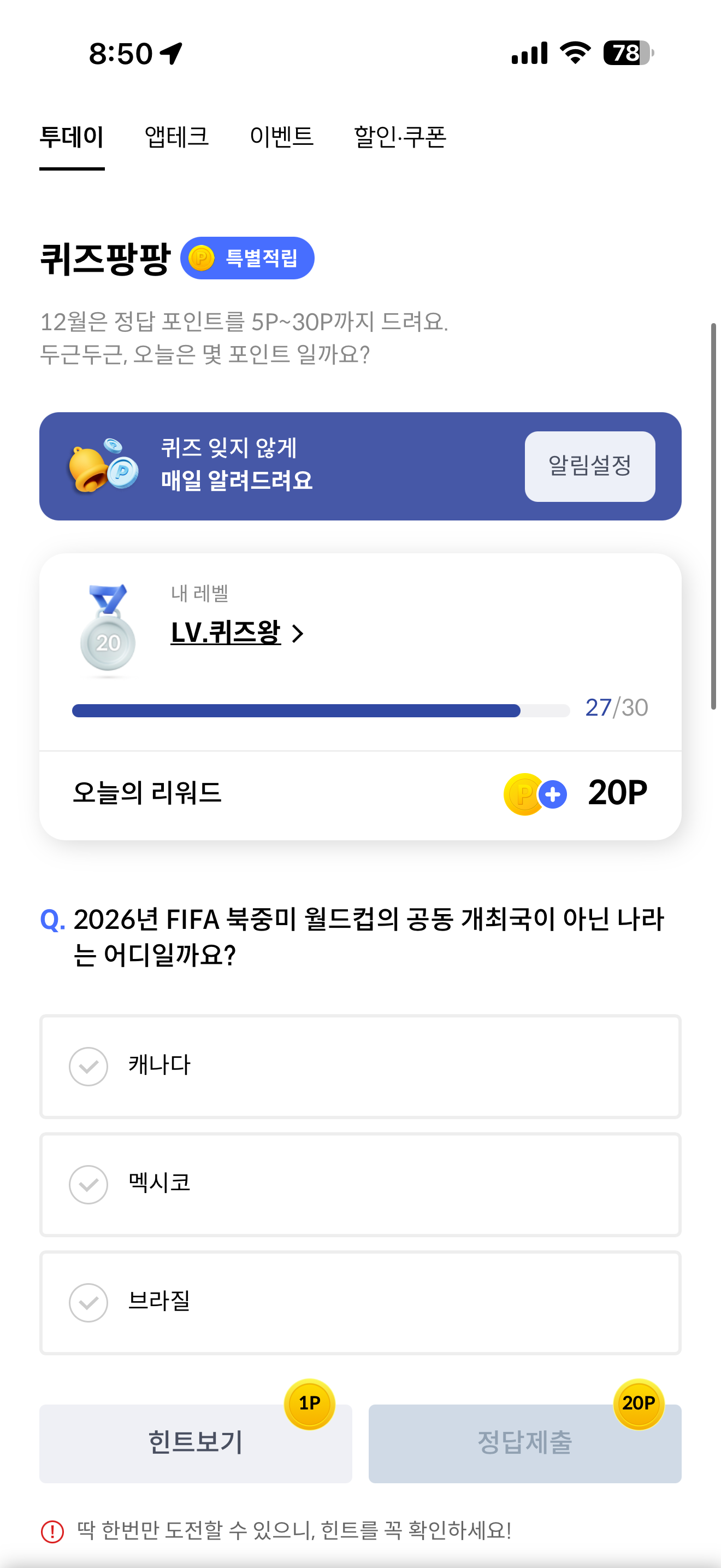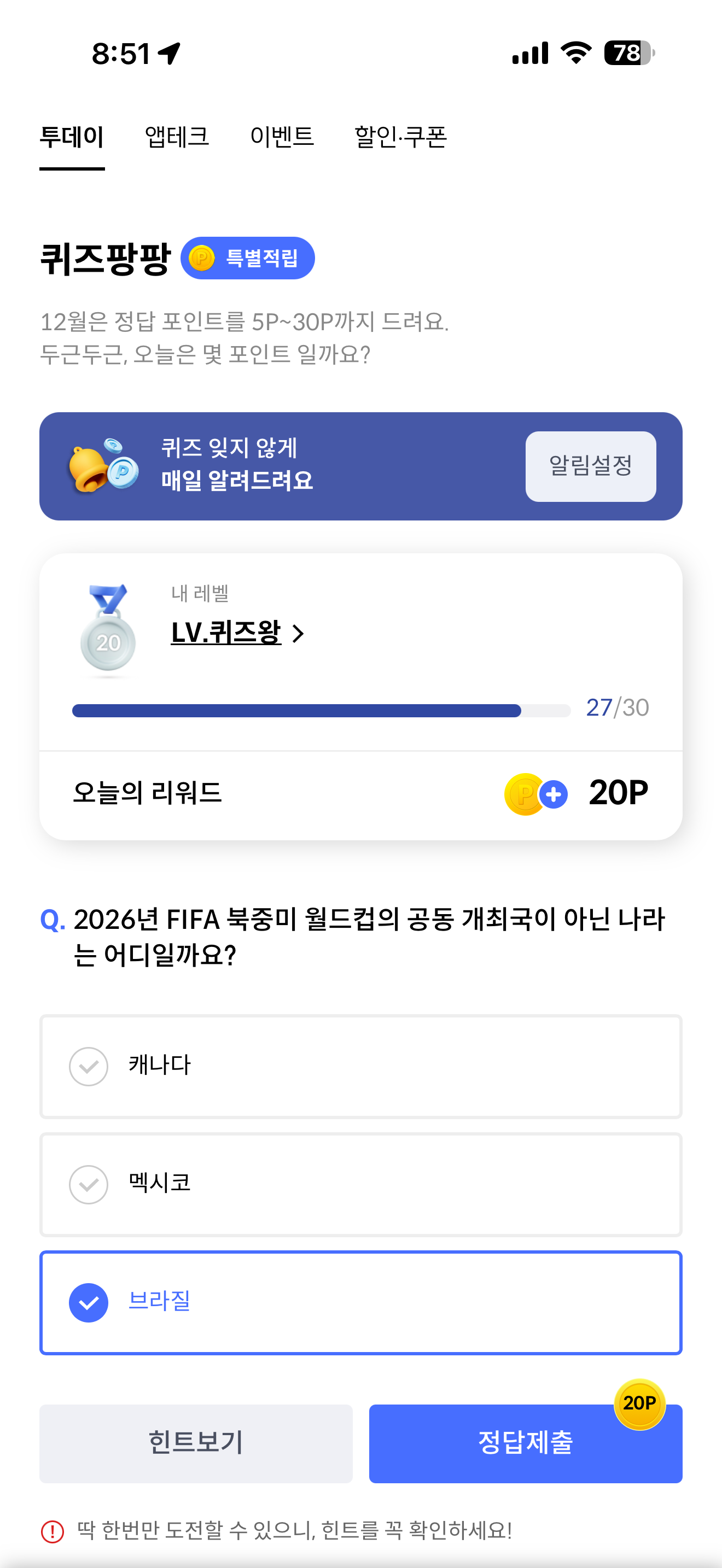 신한카드 퀴즈팡팡 정답은 브라질 입니다