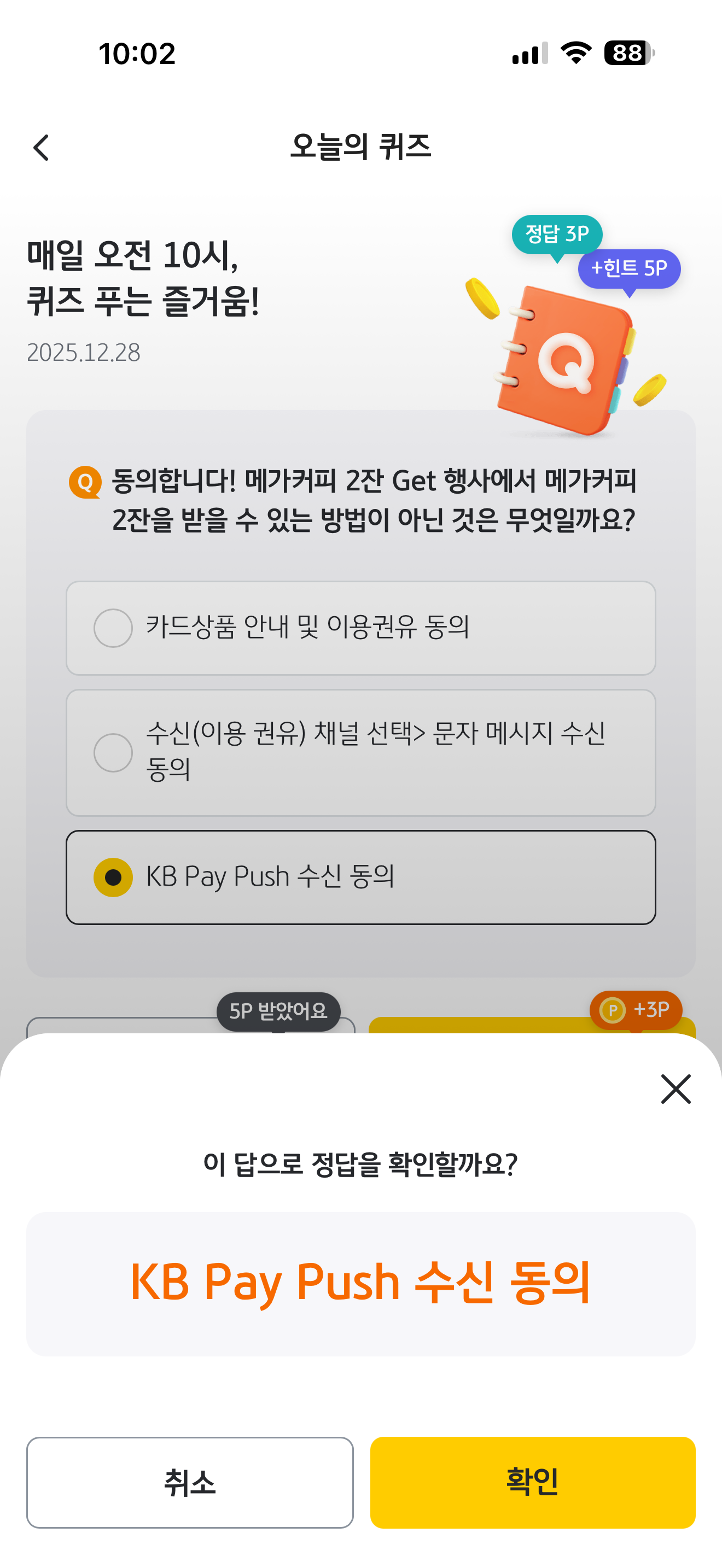 동의합니다! 메가커피 2잔 Get 행사에서 메가커피 2잔을 받을 수 있는 방법이 아닌 것은 무엇일까요? 보기는 1. 카드상품 안내 및 이용권유 동의 2. 수신(이용 권유) 채널 선택> 문자 메시지 수신 동의 3. KB Pay Push 수신 동의 입니다