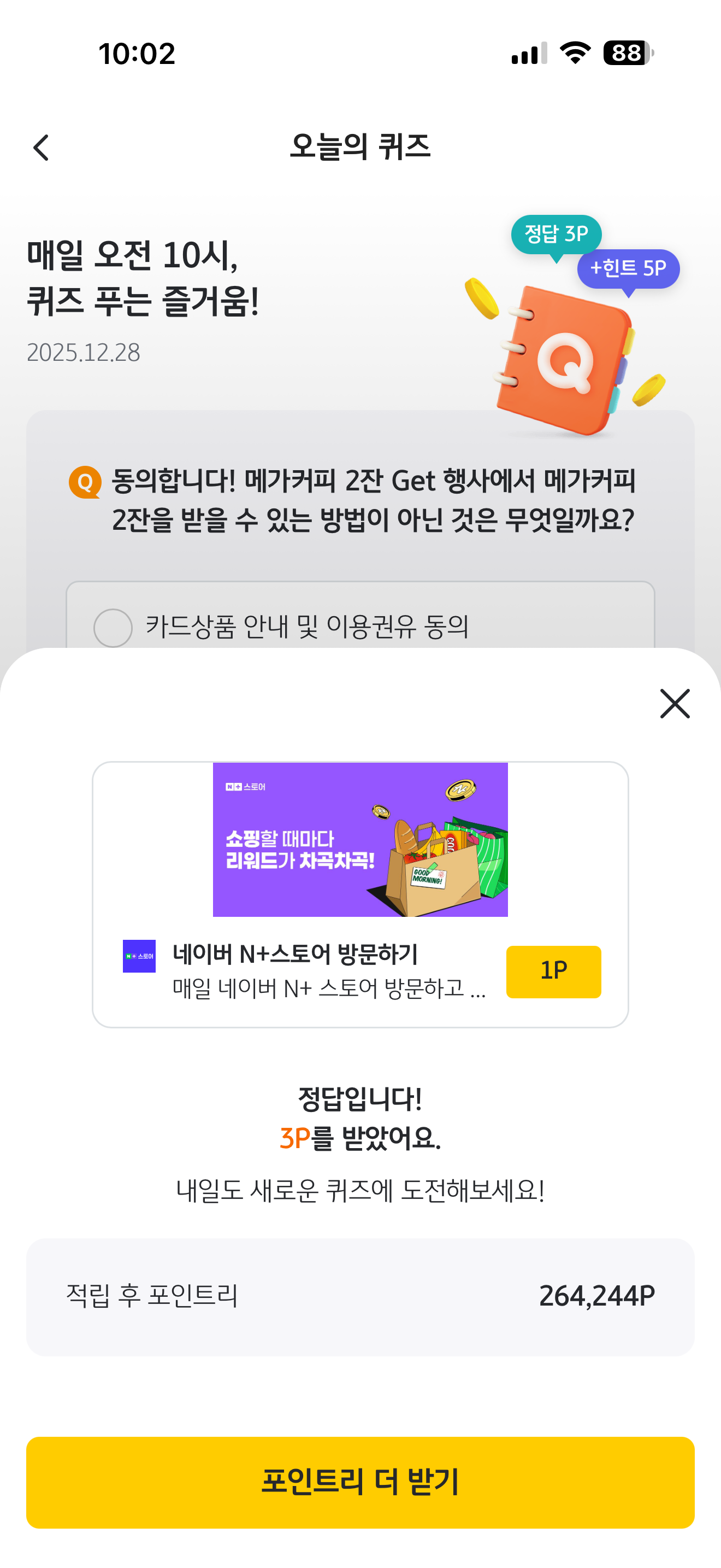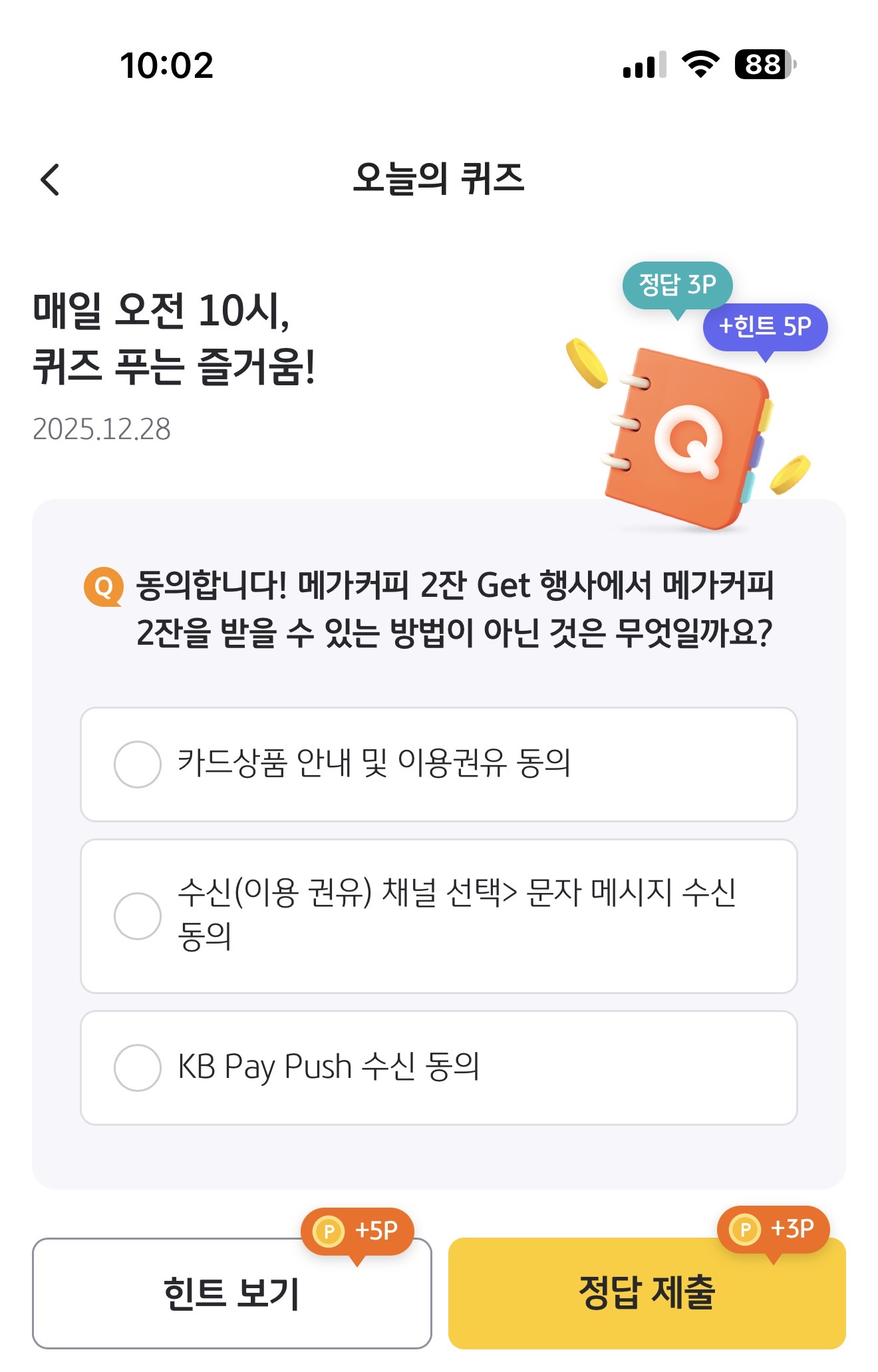 동의합니다! 메가커피 2잔 Get 행사에서 메가커피 2잔을 받을 수 있는 방법이 아닌 것은 무엇일까요? 보기는 1. 카드상품 안내 및 이용권유 동의 2. 수신(이용 권유) 채널 선택> 문자 메시지 수신 동의 3. KB Pay Push 수신 동의 입니다