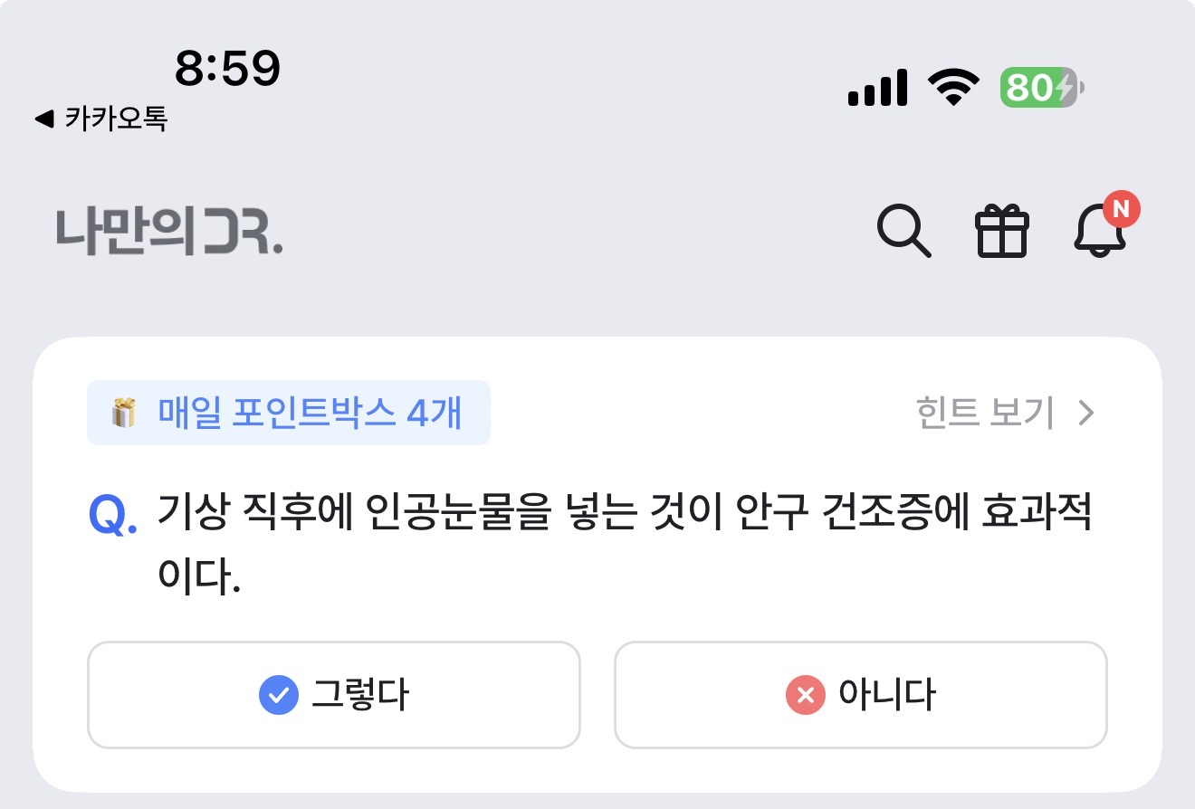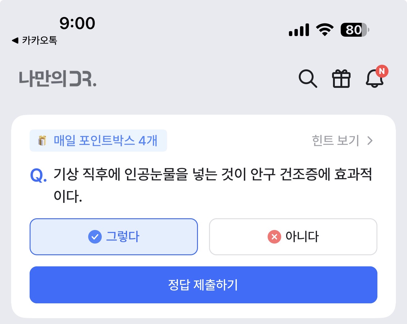 나만의 닥터 퀴즈 12월 28일 정답(기상 직후에 인공눈물을 넣는 것이 안구 건조정에 효과적이다)